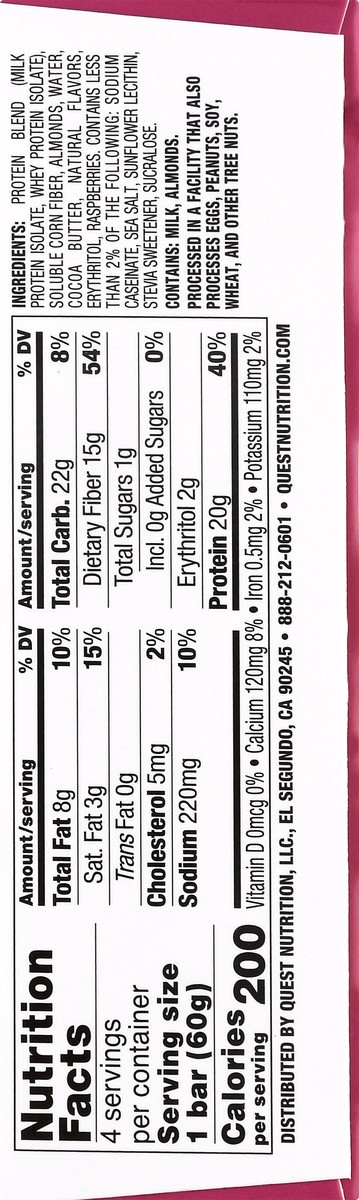 Protein Blend (Milk Protein Isolate, Whey Protein Isolate), Soluble Corn Fiber, Almonds, Water, Cocoa Butter, Natural Flavors, Erythritol, Raspberries, Contains Less than 2% of the Following: Sodium C…