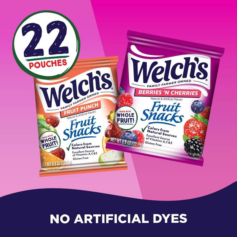- 22 CT SNACK BOX - Contains 22 Ct of 0.8oz Snack Packs of Welch's Fruit Snacks in delicious combo of Fruit Punch & Berries 'N Cherries flavors in a standard cardboard box