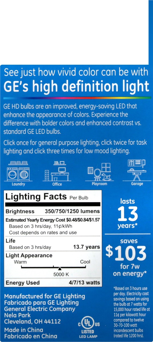 Brightness Quantity: 350 lumens; 750 lumens; 1250 lumens. Energy Info: $0.48; $0.84; $1.57 based on 3 hrs/day, 11 cents/kWh. Cost depends on rates and use. 4 watts; 7 watts; 13 watts. Voltage: . Bulb …
