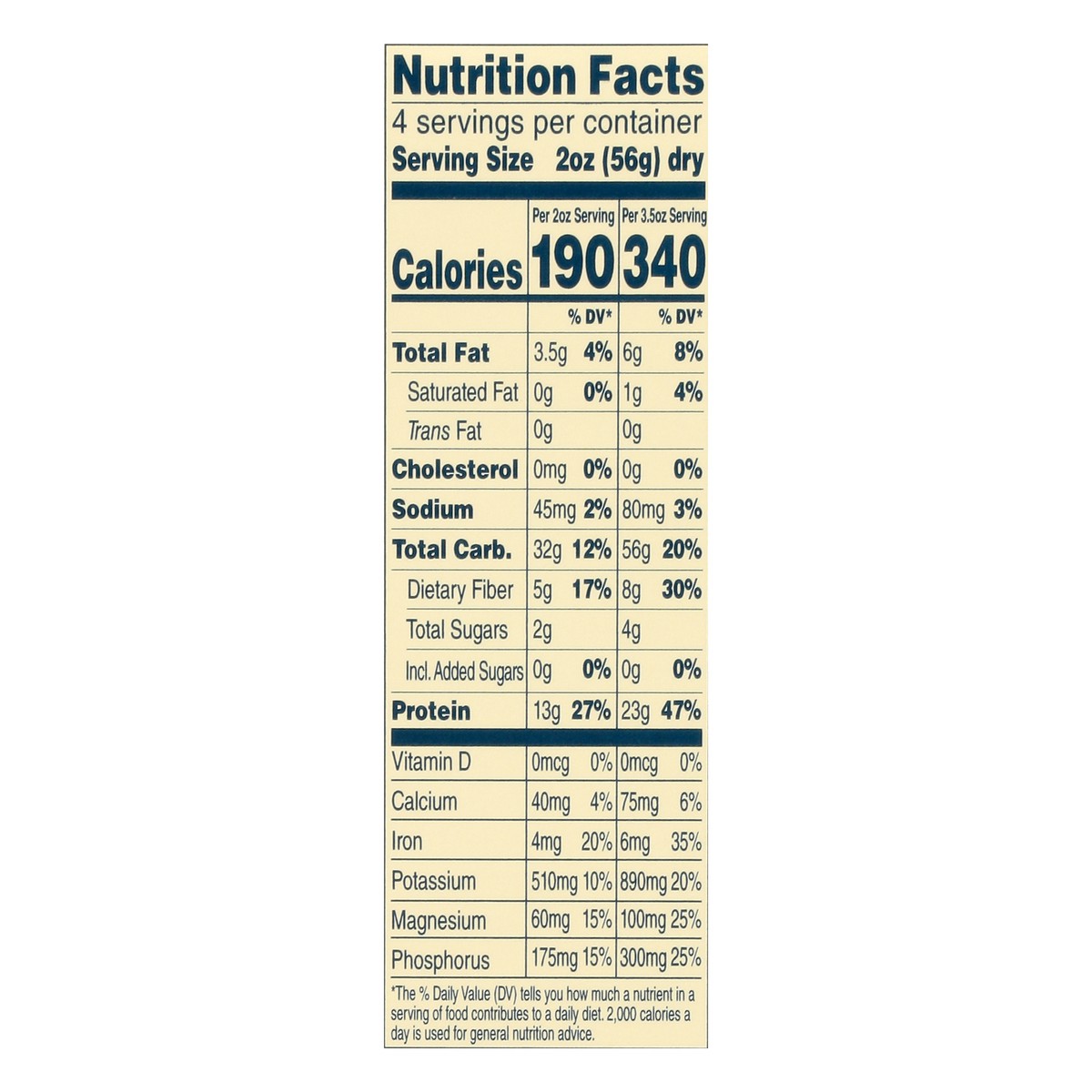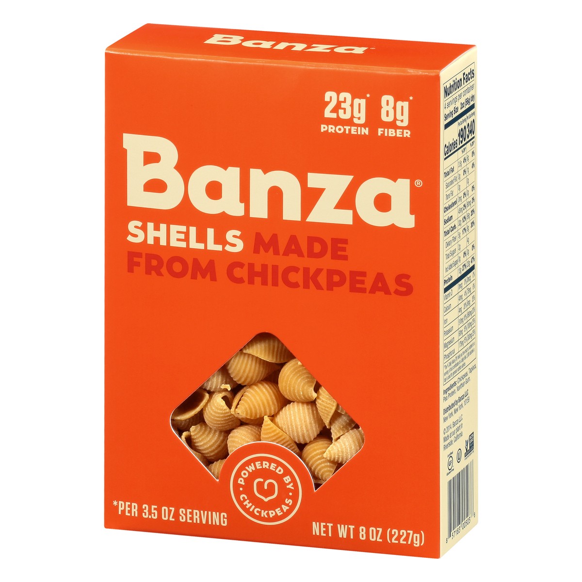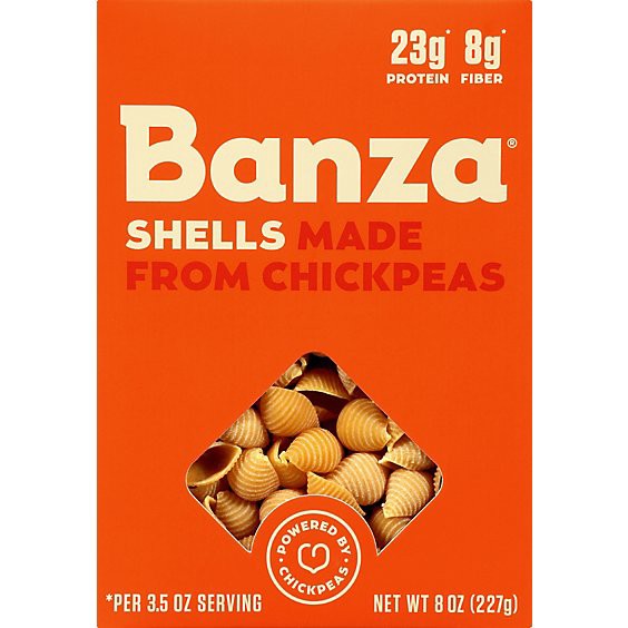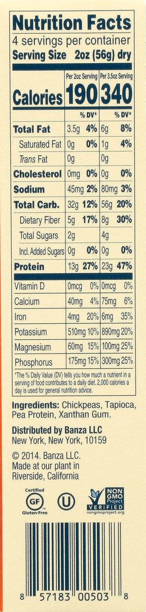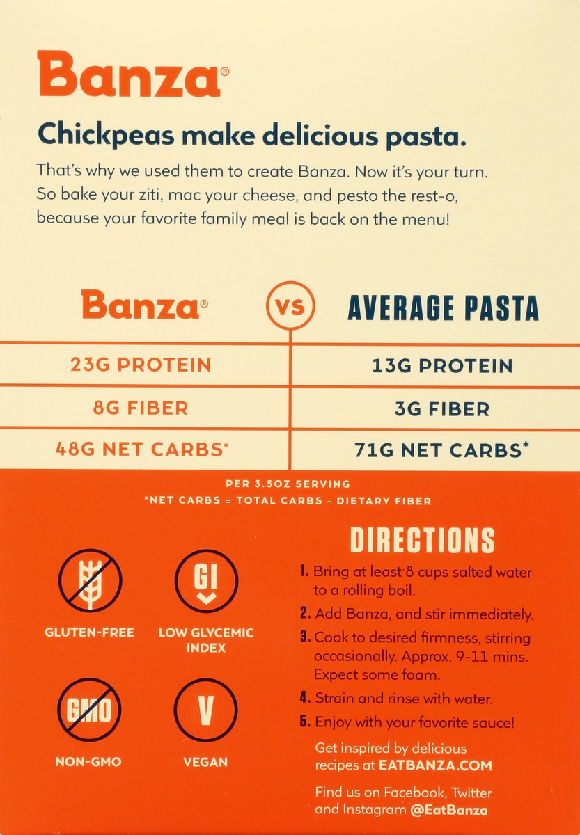 23 g protein (Per 3.5 oz serving). 8 g fiber (Per 3.5 oz serving). Gluten free. Certified gluten-free. Vegan. Low glycemic index. Per 3.5 oz Serving: Banza: 23 g protein; 8 g fiber; 48 g net carbs (Ne…