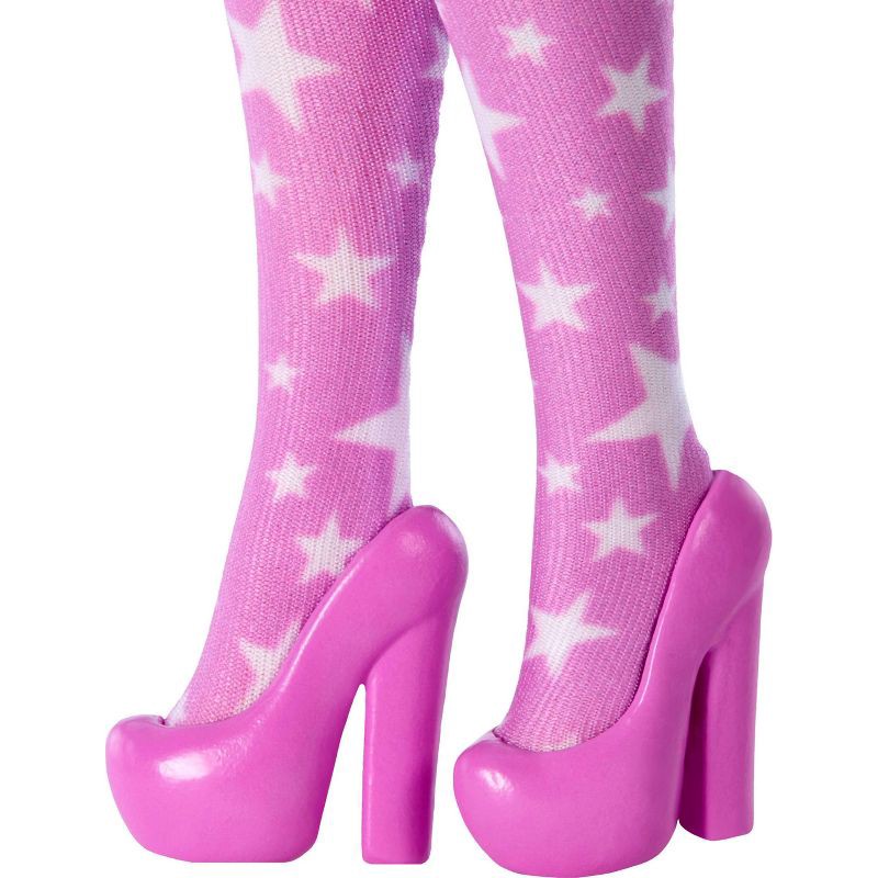 - This Barbie doll has an athletic body type and wears her black hair styled in a high bun! Her strapless 'denim' wrap dress has an all-over star print and a cute accent detail at the waist.
