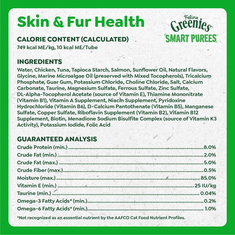 - Protein-Packed Puree Cat Treats With A Benefit: Feline Greenies Smart Puree Skin & Fur Health lickable cat treats help nourish your feline's skin and maintain healthy fur with omega-3 fatty acids from marine microalgae oil.