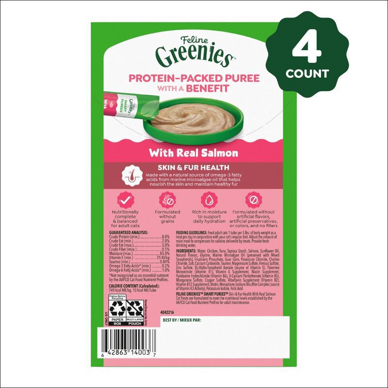 - Single-Serve Cat Treats: Contains four (4) 0.49 tubes of Feline Greenies Smart Purees Skin & Fur Health With Real Salmon lickable cat treats.