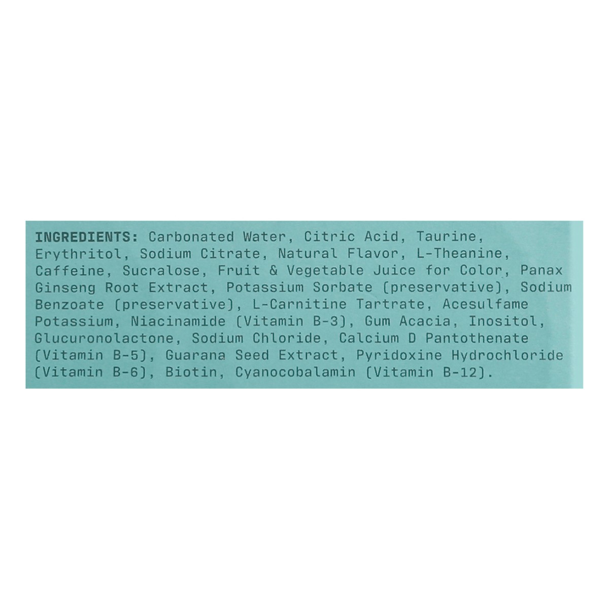 Carbonated Water, Citric Acid, Taurine, Erythritol, Sodium Citrate, Natural Flavor, L-Theanine, Caffeine, Sucralose, Fruit & Vegetable Juice for Color, Panax Ginseng Root Extract, Potassium Sorbate (P…
