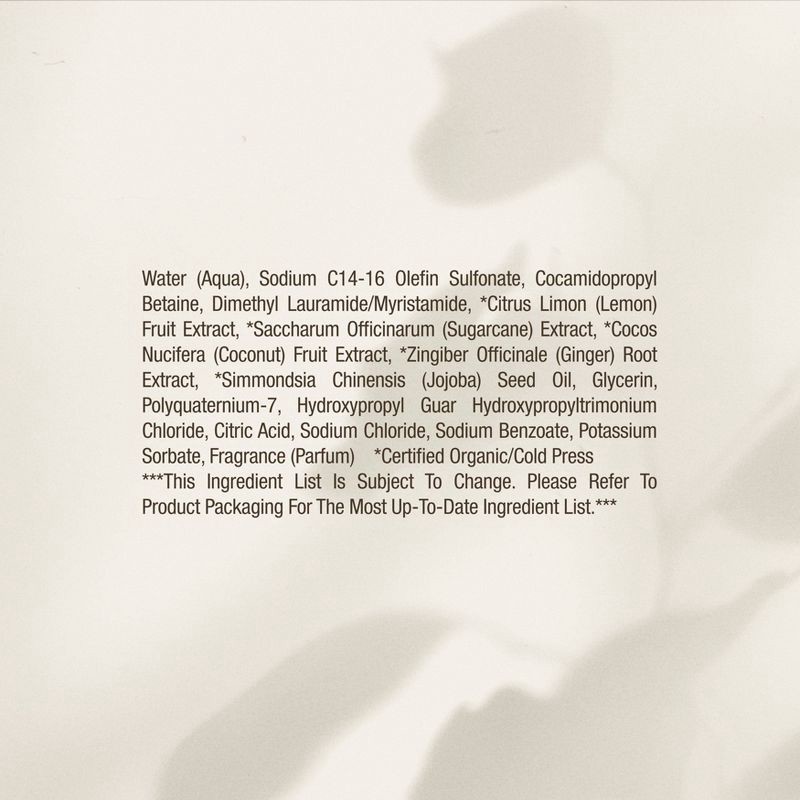 Water (Aqua), Sodium C14-16 Olefin Sulfonate, Cocamidopropyl Betaine, Dimethyl Lauramide/Myristamide, *Citrus Limon (Lemon) Fruit Extract, *Saccharum Officinarum (Sugarcane) Extract, *Cocos Nucifera (…