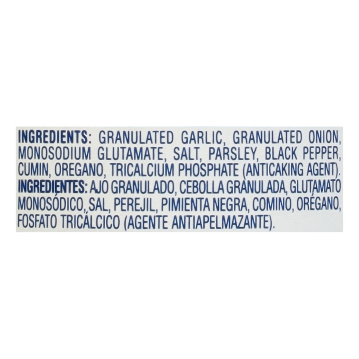 Granulated Garlic, Granulated Onion, Monosodium Glutamate, Salt, Parsley, Black Pepper, Cumin, Oregano, Tricalcium Phosphate (Anticaking Agent).