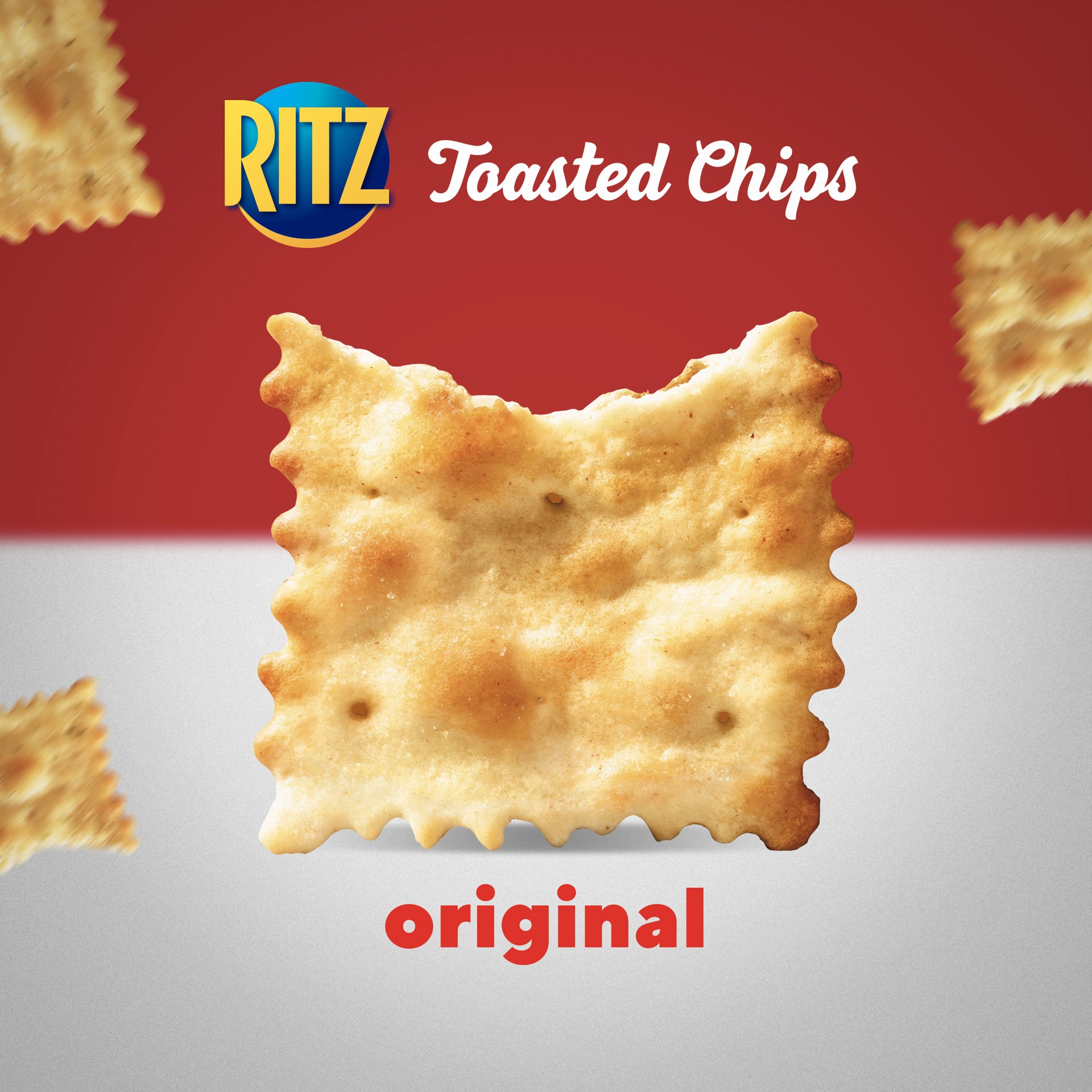 RITZ Original Toasted Chips are a crispy, crunchy twist on the classic cracker you know and love. These oven baked chips are toasted, not fried, so they contain 50 percent less fat per serving than th…