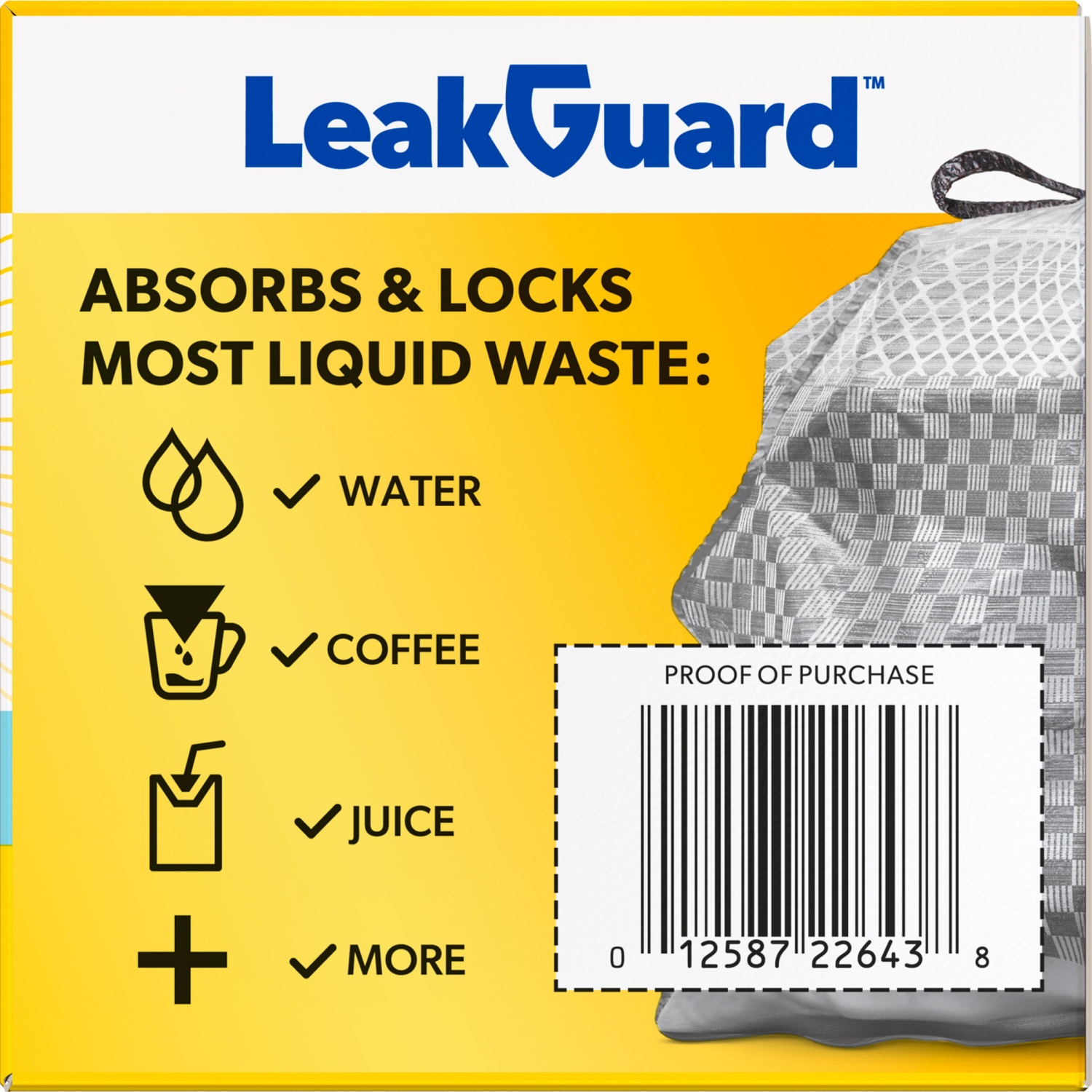 The Glad ForceFlex MaxStrength LeakGuard Tall Kitchen Drawstring Trash Bag absorbs and locks liquids to help stop leaks.