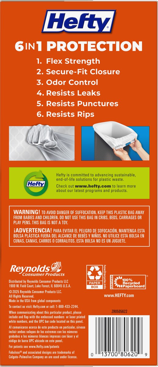 (49.2 l) 23-3/4 in x 24-7/8 in (60.3 cm x 63.1 cm) .85 mil (21.5 mcm). 6 in 1 Protection: Flex strength, secure-fit closure, Odor control. Resists leaks. Punctures. Rips. Ultra strong. fits 13 gallon …