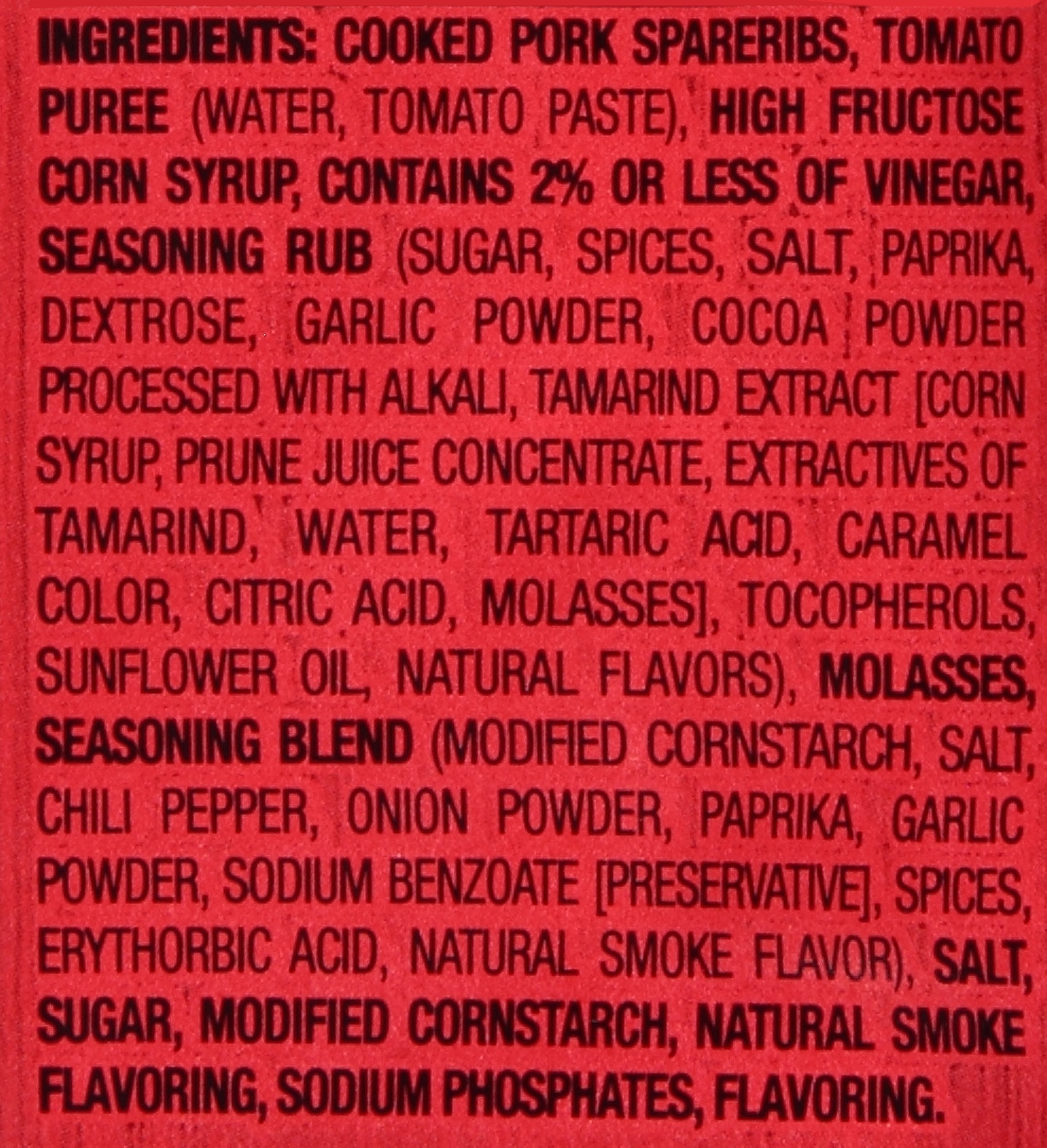 Cooked Pork Spareribs, Tomato Puree (Water, Tomato Paste), High Fructose Corn Syrup, Contains 2% or Less of Vinegar, Seasoning Rub (Sugar, Spices, Salt, Paprika, Dextrose, Garlic Powder, Cocoa Powder …