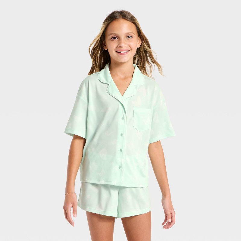 Girls' Butterflies Printed Button-Down Pajama Set - art class™ Turquoise Green XL