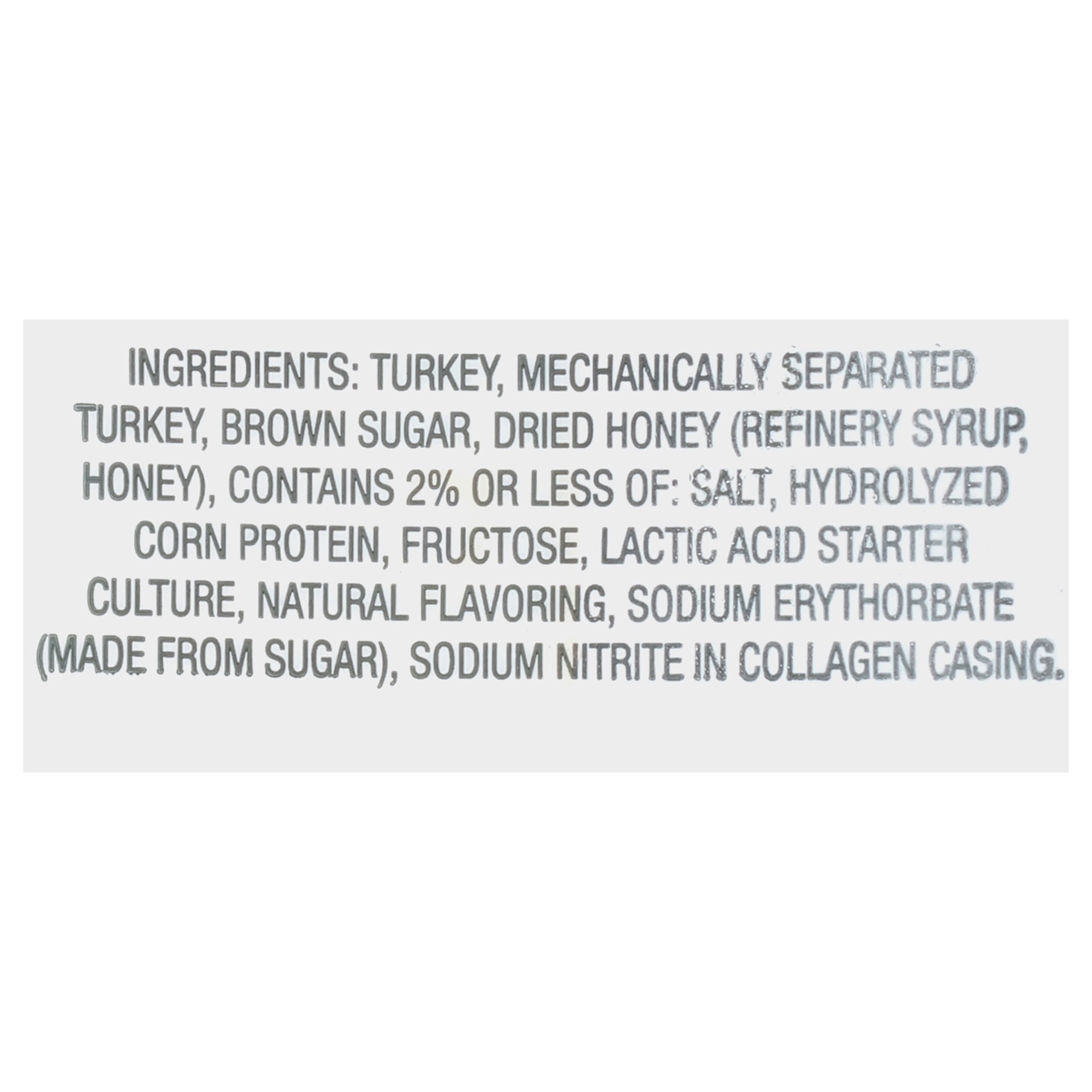 Turkey, Mechanically Separated Turkey, Brown Sugar, Dried Honey, (Refinery Syrup Honey), Contains 2% or Less of Salt, Hydrolyzed Corn Protein, Fructose, Lactic Acid Starter Culture, Natural Flavoring,…
