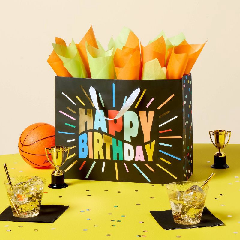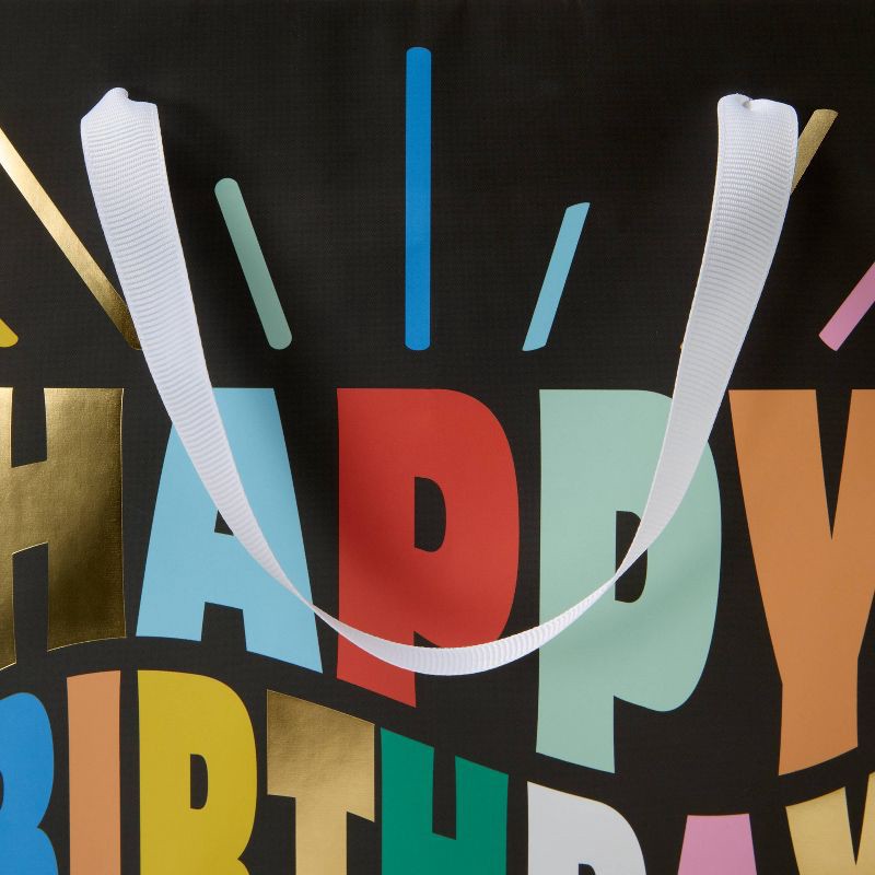 - Large, roomy gift bag with "Happy Birthday" print and gold foil accents