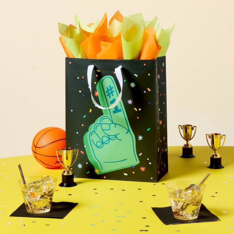 Make your surprises even more presentable with the Medium Foam Finger Birthday Gift Bag Black/Green from Spritz™. Featuring a bold foam finger design, this medium bag adds a fun touch to birthday gift…