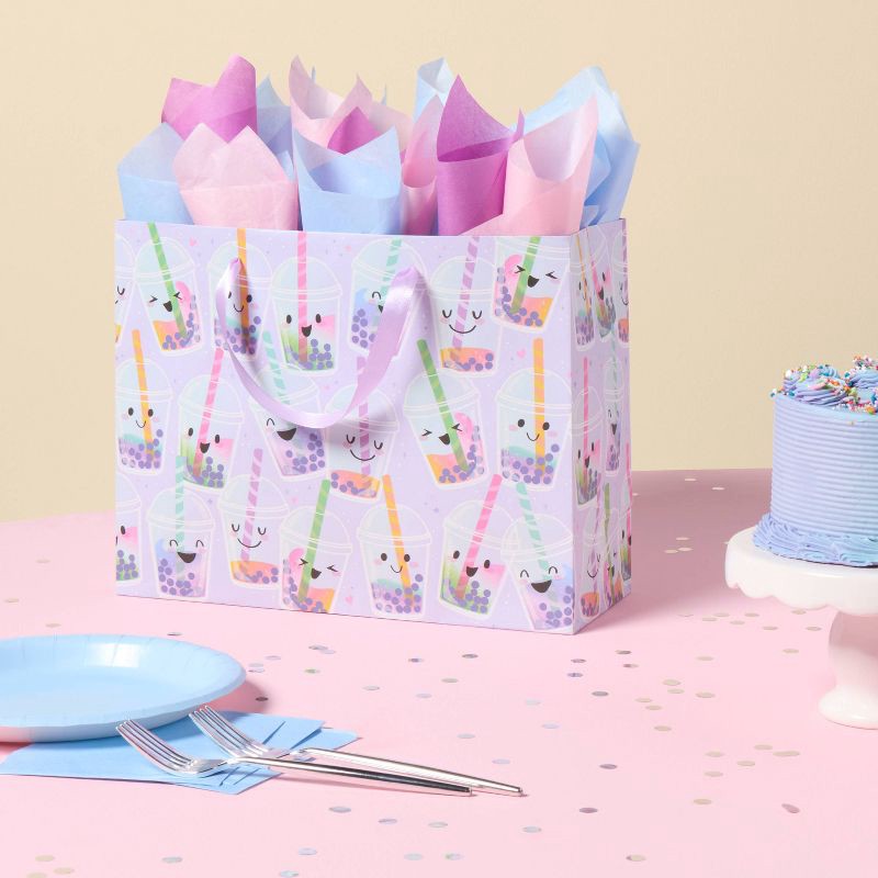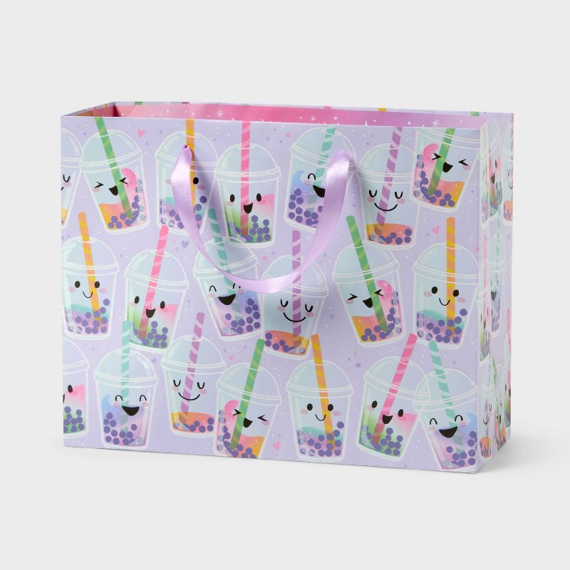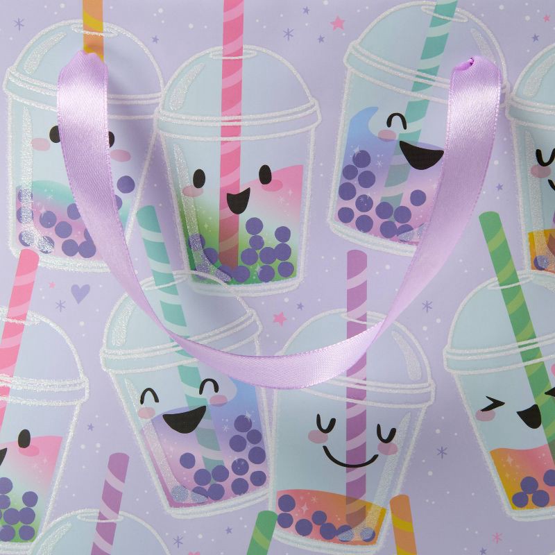 Large Iridescent Glitter Boba Tea Print Birthday Gift Bag Purple - Spritz™