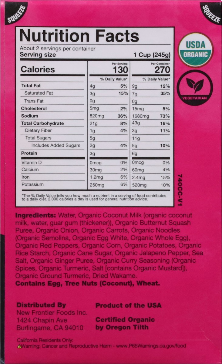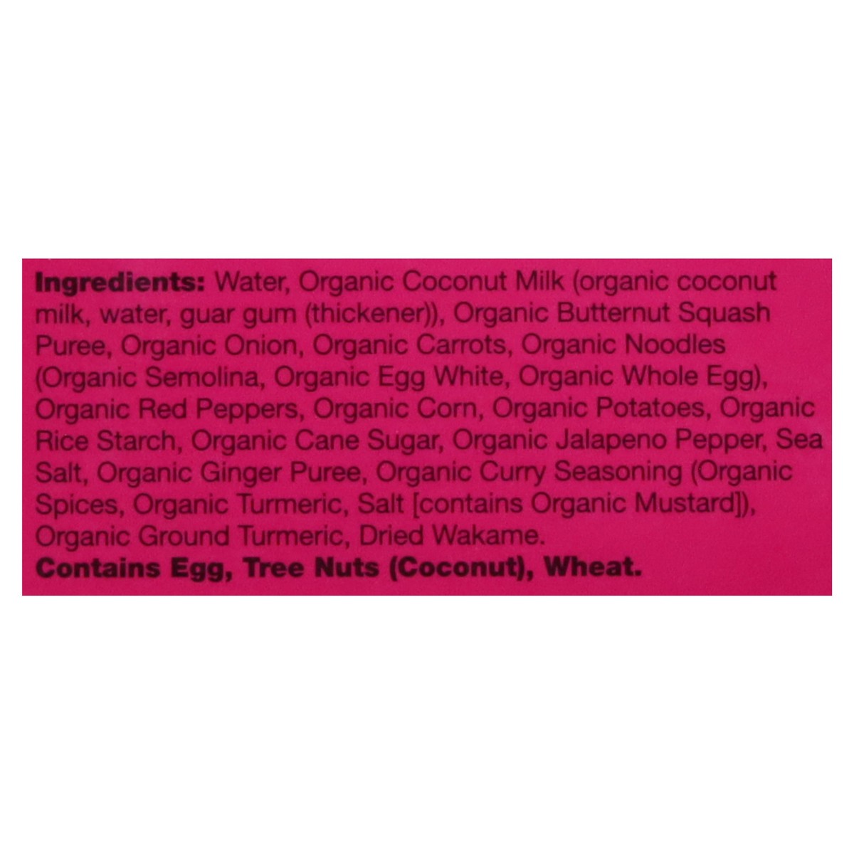 Water, Organic Coconut Milk (Organic Coconut Milk, Water, Guar Gum (Thickener)), Organic Butternut Squash Puree, Organic Onion, Organic Carrots, Organic Noodles (Organic Semolina, Organic Egg White, O…