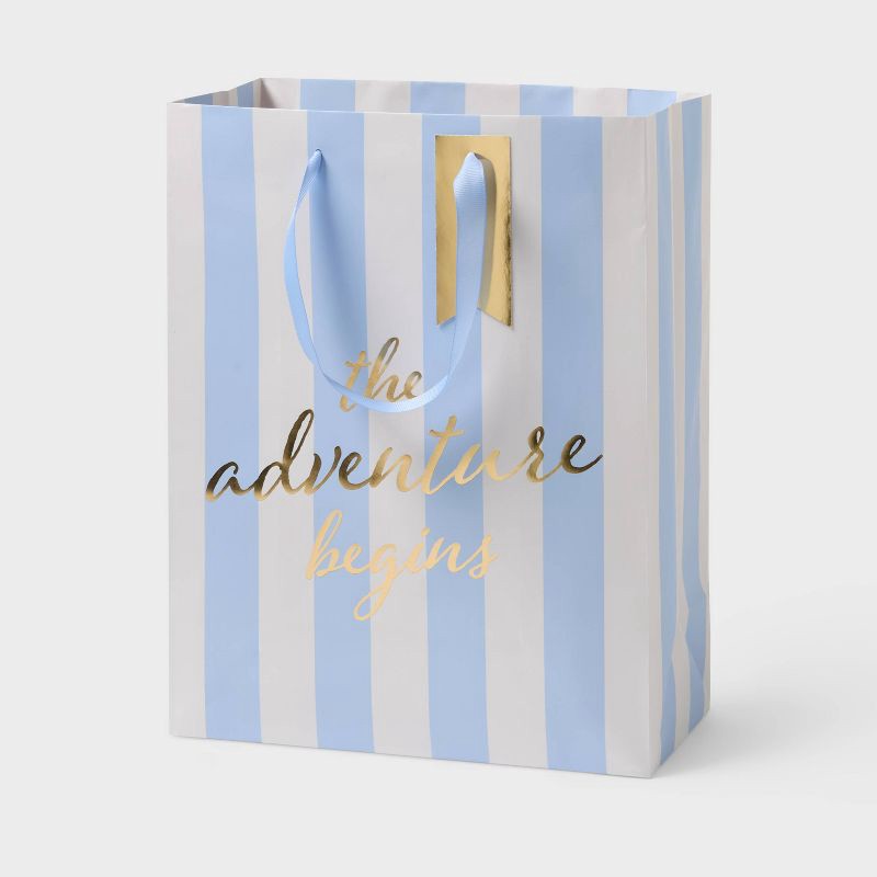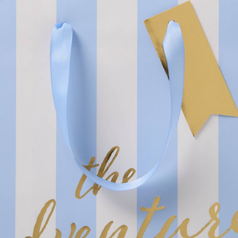 Large Striped "The Adventure Begins" Gift Bag with Tag Blue /Ivory /Gold - Spritz™