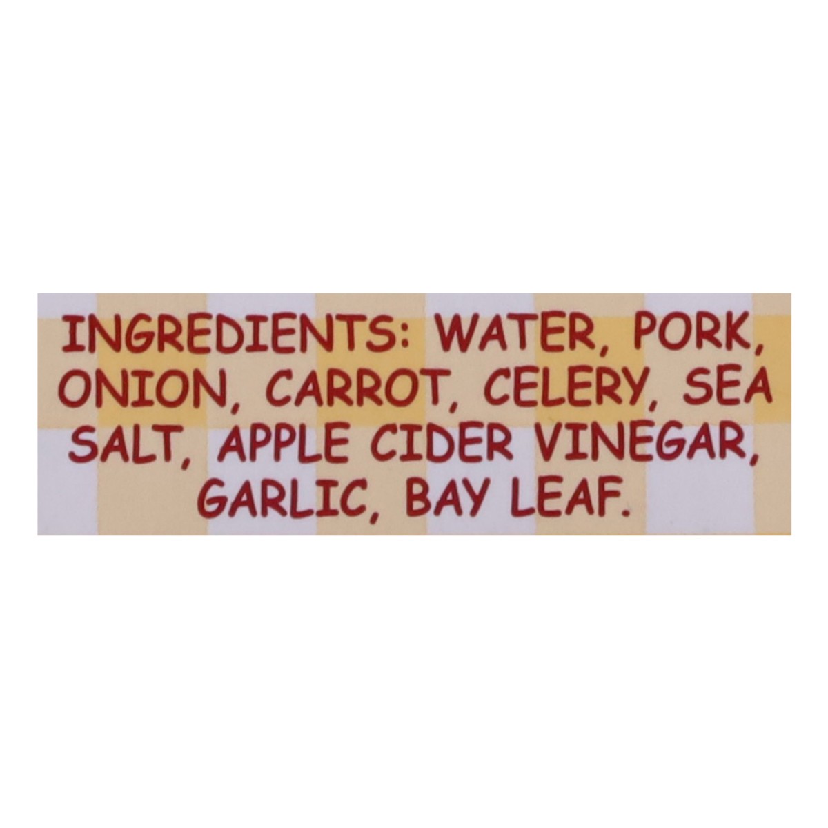 Water, Pork, Onion, Carrot, Celery, Sea Salt, Apple Cider Vinegar, Garlic, Bay Leaf.