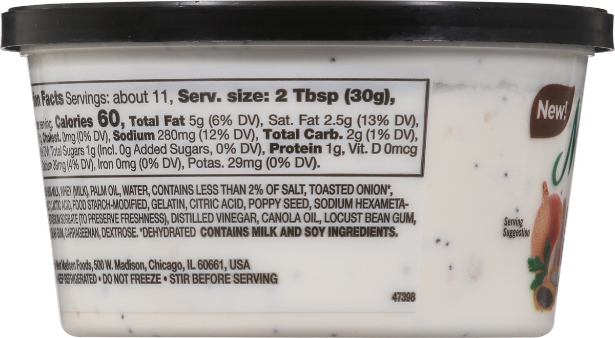SKIM MILK, WHEY (MILK), PALM OIL, WATER, CONTAINS LESS THAN 2% OF SALT, TOASTED ONION*, ROASTED GARLIC*, LACTIC ACID, FOOD STARCH-MODIFIED, GELATIN, CITRIC ACID, POPPY SEED, SODIUM HEXAMETAPHOSPHATE, …