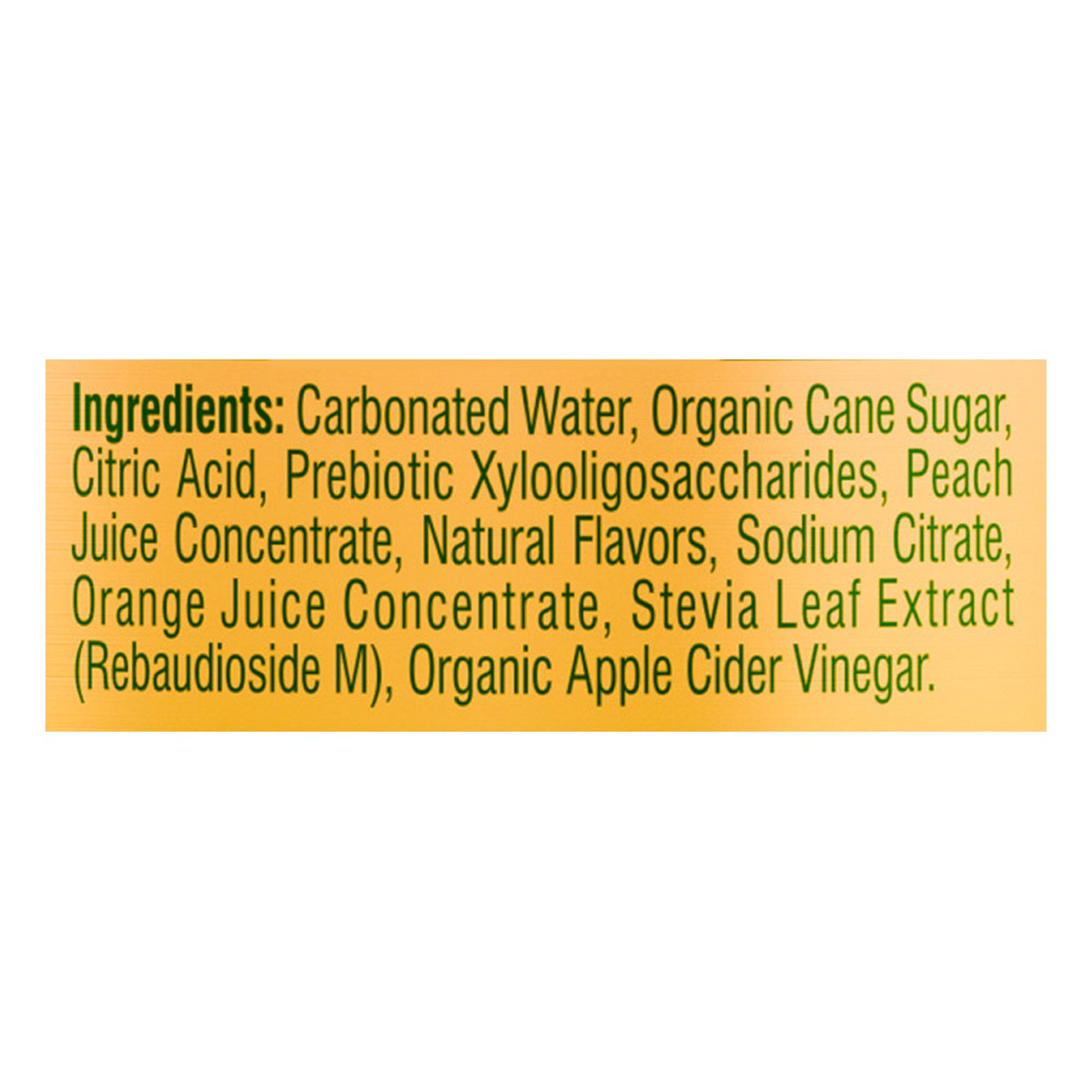 Carbonated Water, Organic Cane Sugar, Citric Acid, Prebiotic Xylooligosaccharides, Peach Juice Concentrate, Natural Flavors, Sodium Citrate, Orange Juice Concentrate, Stevia Leaf Extract (Rebaudioside…