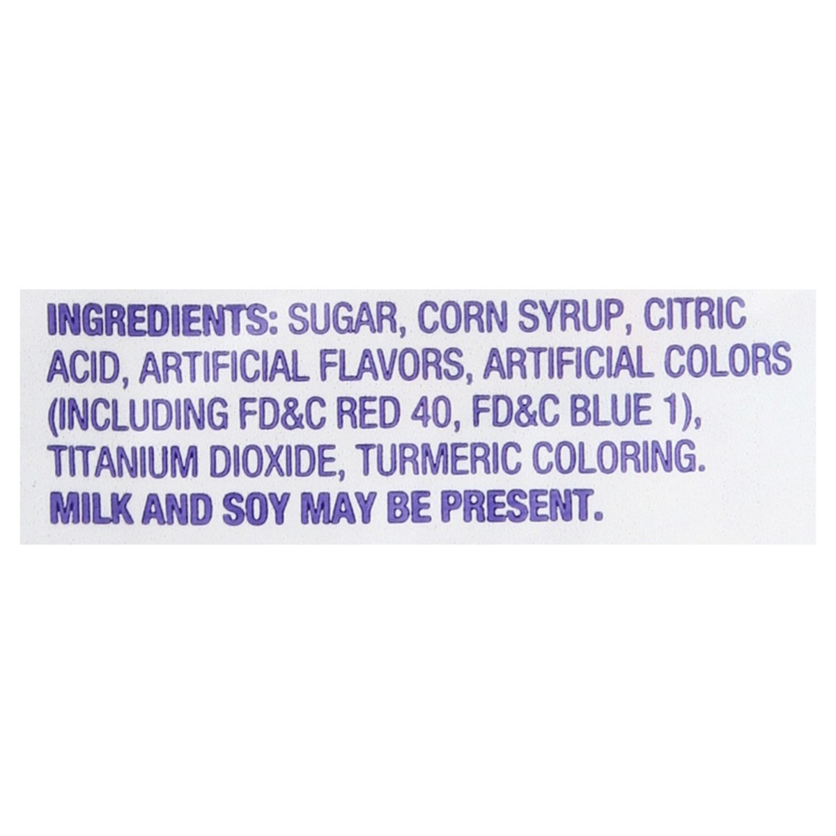 Sugar, Corn Syrup, Citric Acid, Artificial Flavors, Artificial Colors (Including FD&C Red 40, FD&C Blue 1), Titanium Dioxide, Turmeric Coloring.