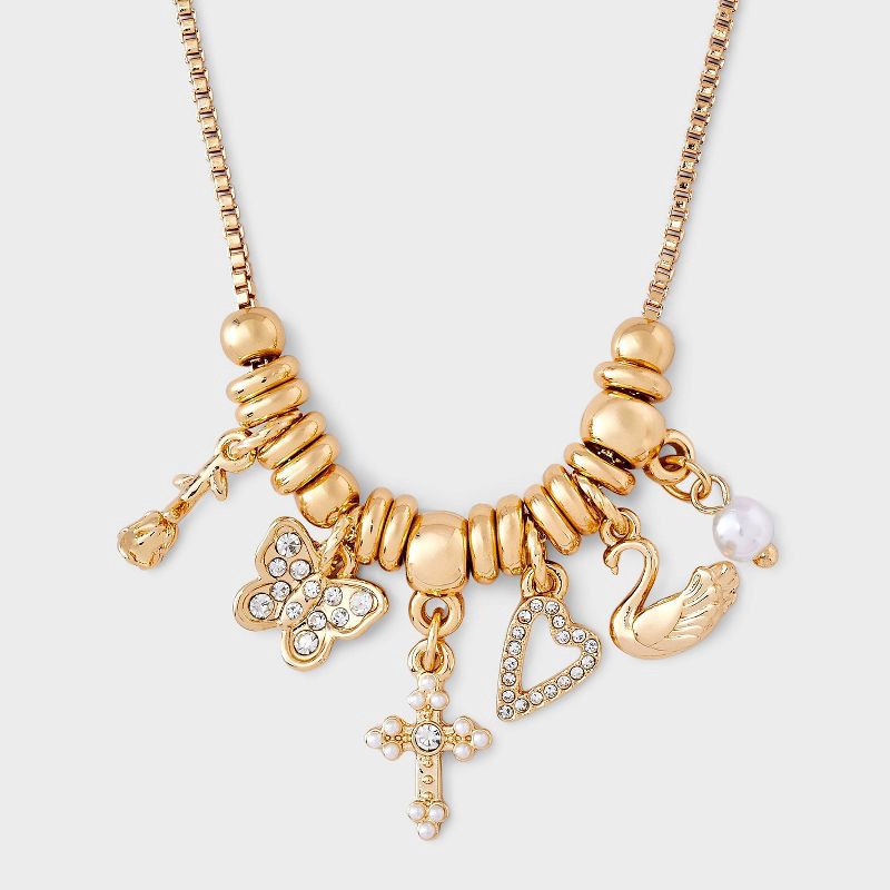 Box chain necklace from Wild Fable™ in a gold-tone finish. Features multiple gold-tone beads at the center front accented by assorted dangling charms — rose, swan and faux-pearl bead charms plus cross…