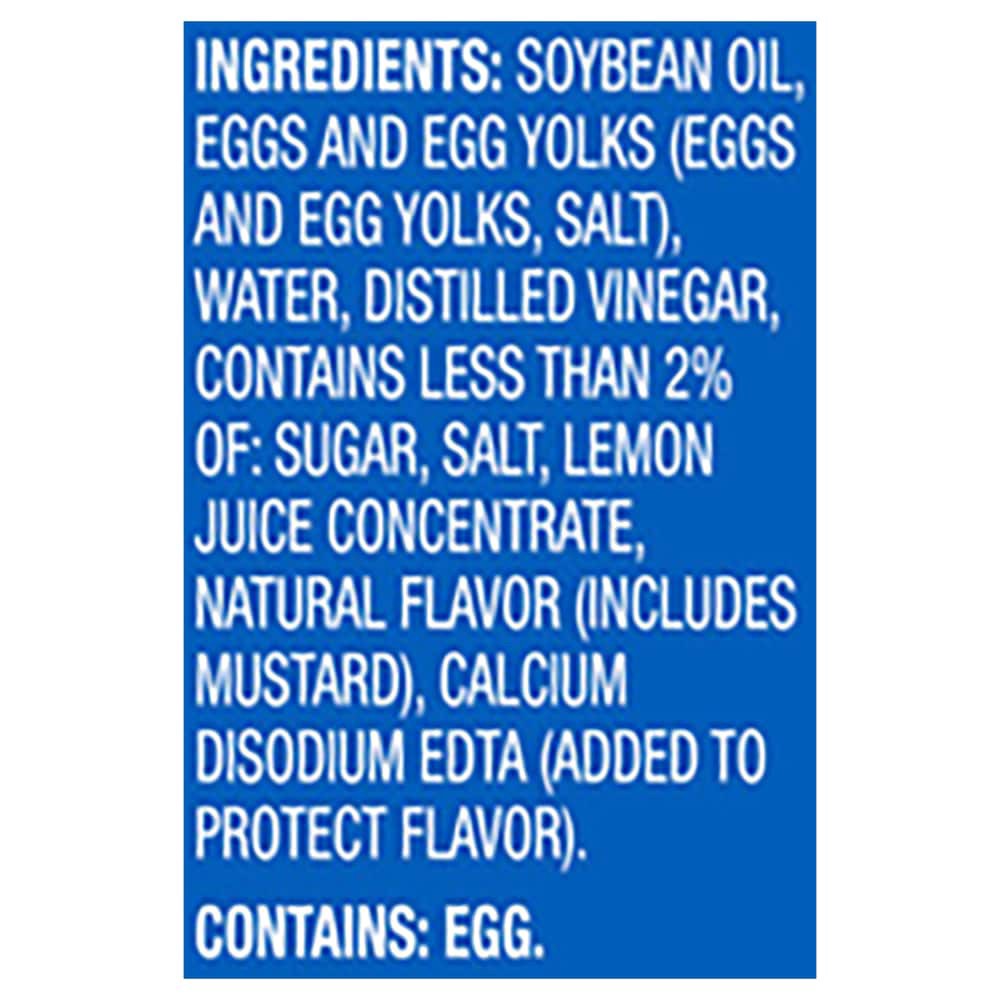 Soybean Oil, Eggs and Egg Yolks (Eggs and Egg Yolks, Salt), Water, Distilled Vinegar, Contains Less than 2% of: Sugar, Salt, Lemon Juice Concentrate, Natural Flavor (Includes Mustard), Calcium Disodiu…
