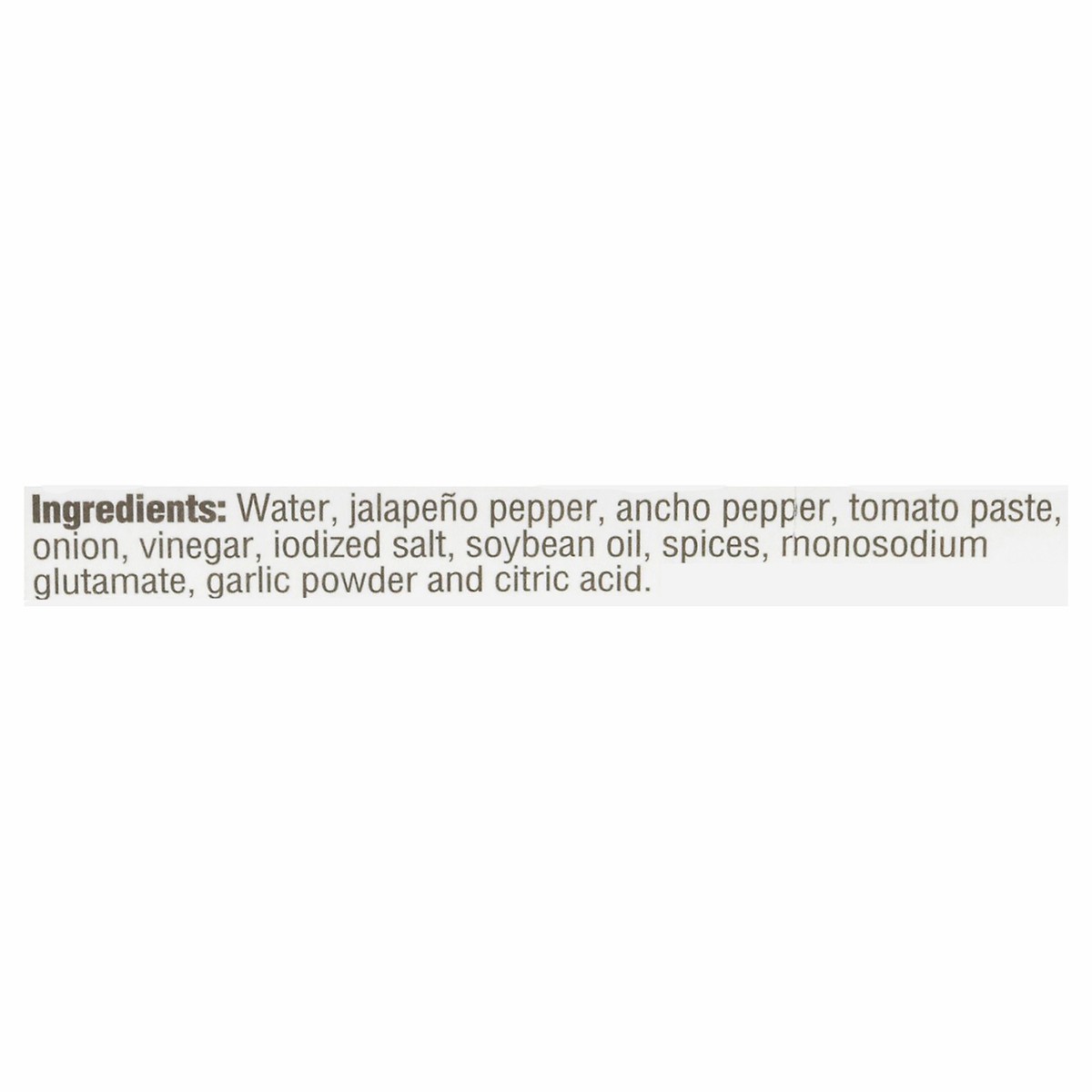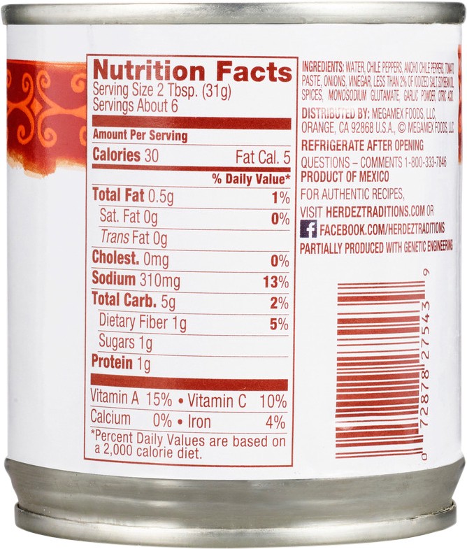 Ingredients: Water, Green Chile Peppers, Ancho Chile Peppers, Tomato Paste, Vinegar, Contains 2% or less of Iodized Salt (Contains Potassium Iodate), Onion Powder, Soybean Oil with TBHQ (Antioxidant),…