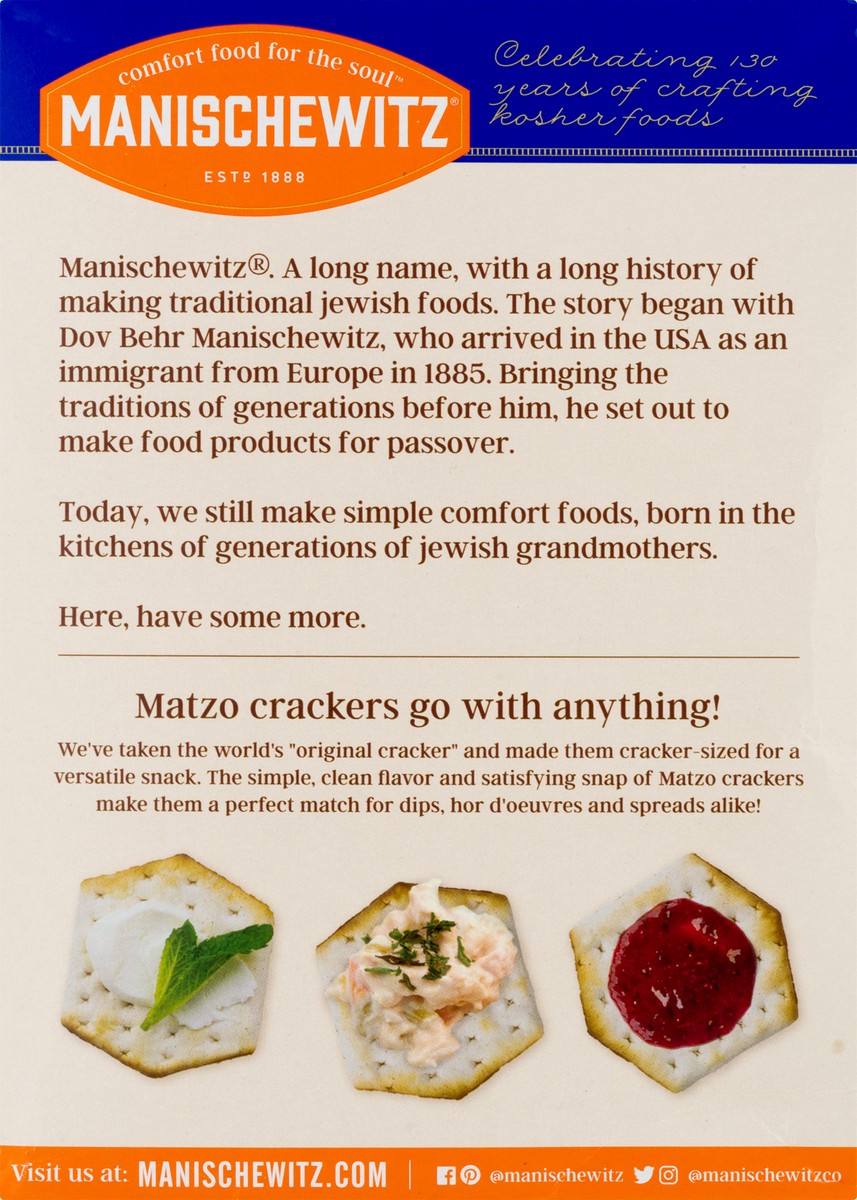 Tastes like matzos, shaped like crackers. A classic flavor that goes with any topping. The Passover collection. Comfort food for the soul. The Manischewitz Co. Generations of Kashrus & Quality. Estd 1…