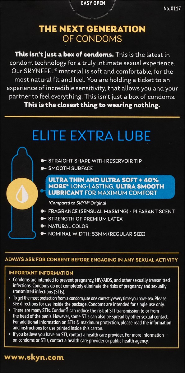 Extra Comfort: the extra amount of silky smooth lubrication, 40% more than in our Original condoms, gives you a superior comfort experience. SKYN Elite Extra Lube condoms are designed for an exception…