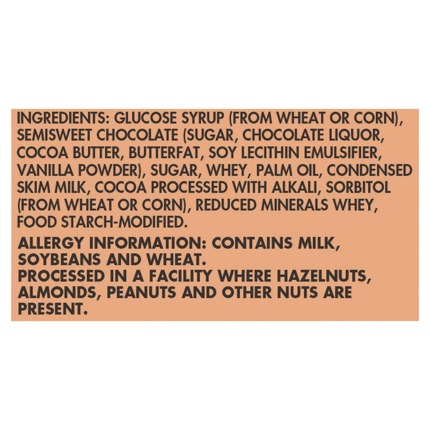 Glucose Syrup (from Wheat or Corn), Semisweet Chocolate (Sugar, Chocolate Liquor, Cocoa Butter, Butterfat, Soy Lecithin Emulsifier, Vanilla Powder), Sugar, Whey, Palm Oil, Condensed Skim Milk, Cocoa P…