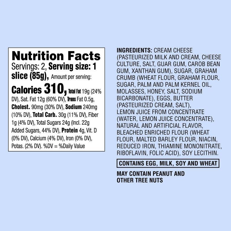CREAM CHEESE (PASTEURIZED MILK AND CREAM, CHEESE CULTURE, SALT, GUAR GUM, CAROB BEAN GUM, XANTHAN GUM), SUGAR, GRAHAM CRUMB (WHEAT FLOUR, GRAHAM FLOUR, SUGAR, PALM AND PALM KERNEL OIL, MOLASSES, HONEY…