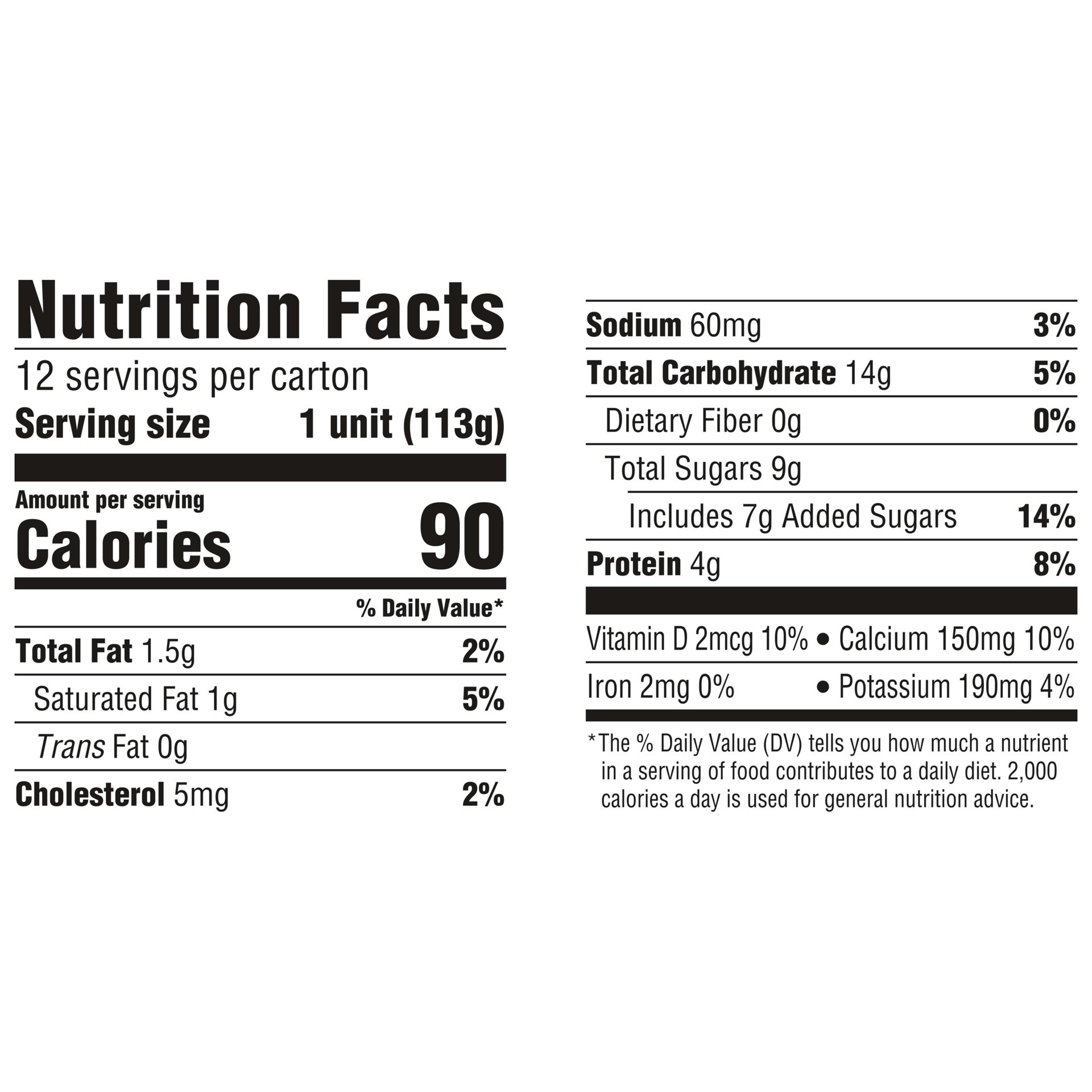 Cultured Reduced Fat Milk, Cane Sugar, Water, Modified Food Starch, Less than 1%: Natural Flavors, Milk Protein Concentrate, Kosher Gelatin, Agar Agar, Lactic Acid, Vitamin D3, Live Cultures: L. Bulga…