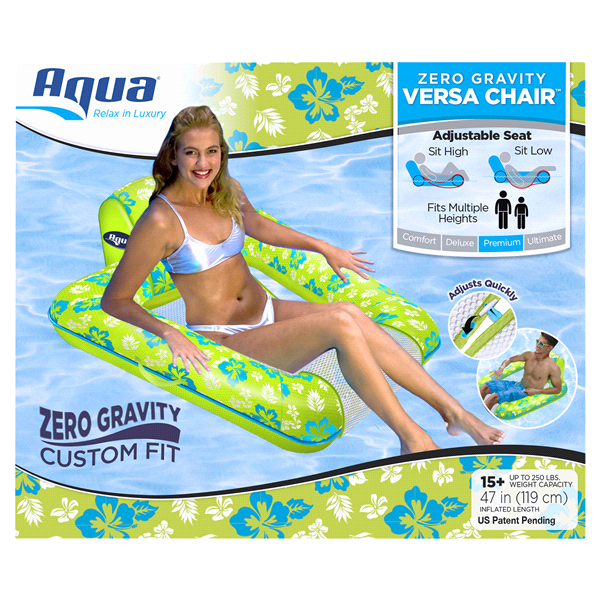 Zero gravity, weightlessness, stress-free comfort, Adjusts for multiple sizessmall, medium, and tallChoose to sit low or high in the water, Soft, Cool Weave mesh arm rests and leg bolster, allows wate…