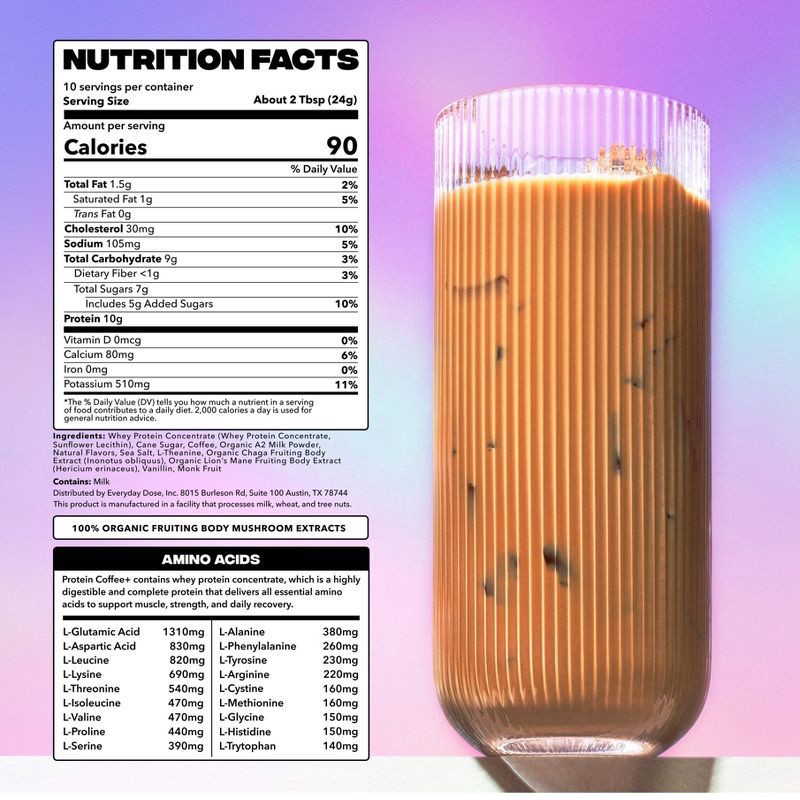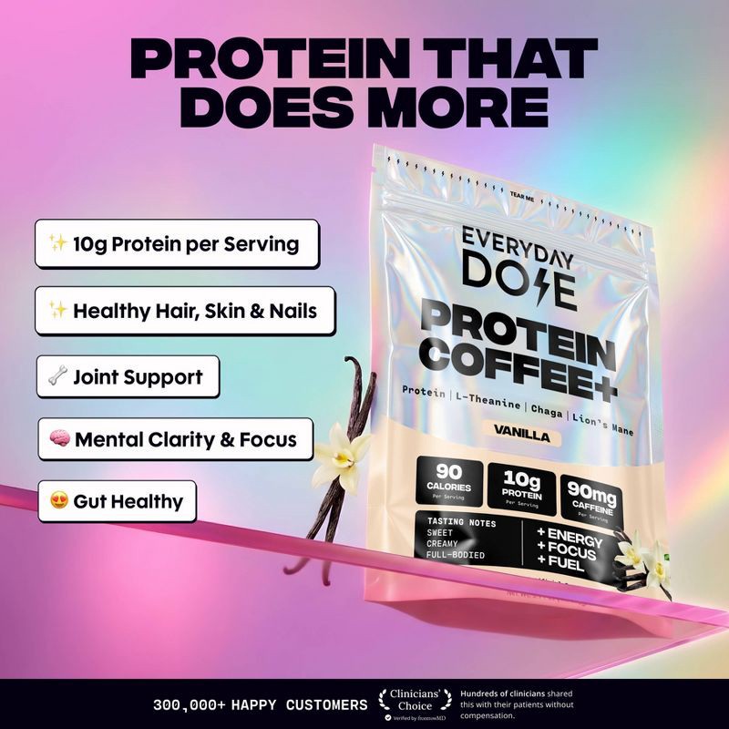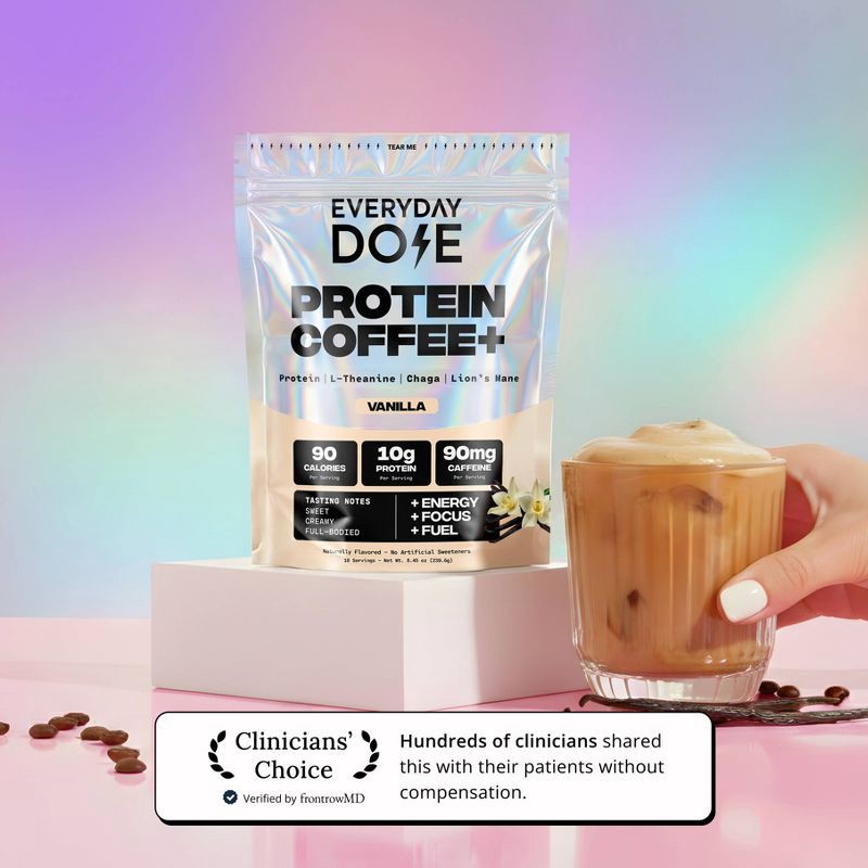 Everyday Dose Vanilla Protein Coffee+ is a smooth, nourishing protein latte designed for steady energy and calm focus whenever you need it.Made with real coffee, 10g of whey protein, lion's mane, chag…