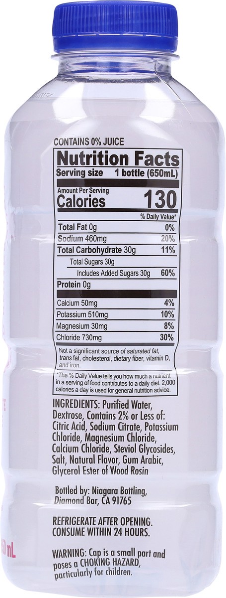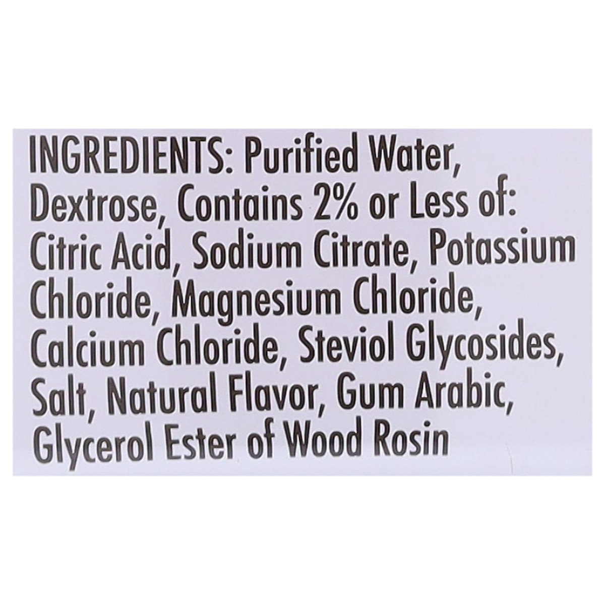 Purified Water, Dextrose, Contains 2% or Less of: Citric Acid, Sodium Citrate, Potassium Chloride, Magnesium Chloride, Calcium Chloride, Steviol Glycosides, Salt, Natural Flavor, Gum Arabic, Glycerol …