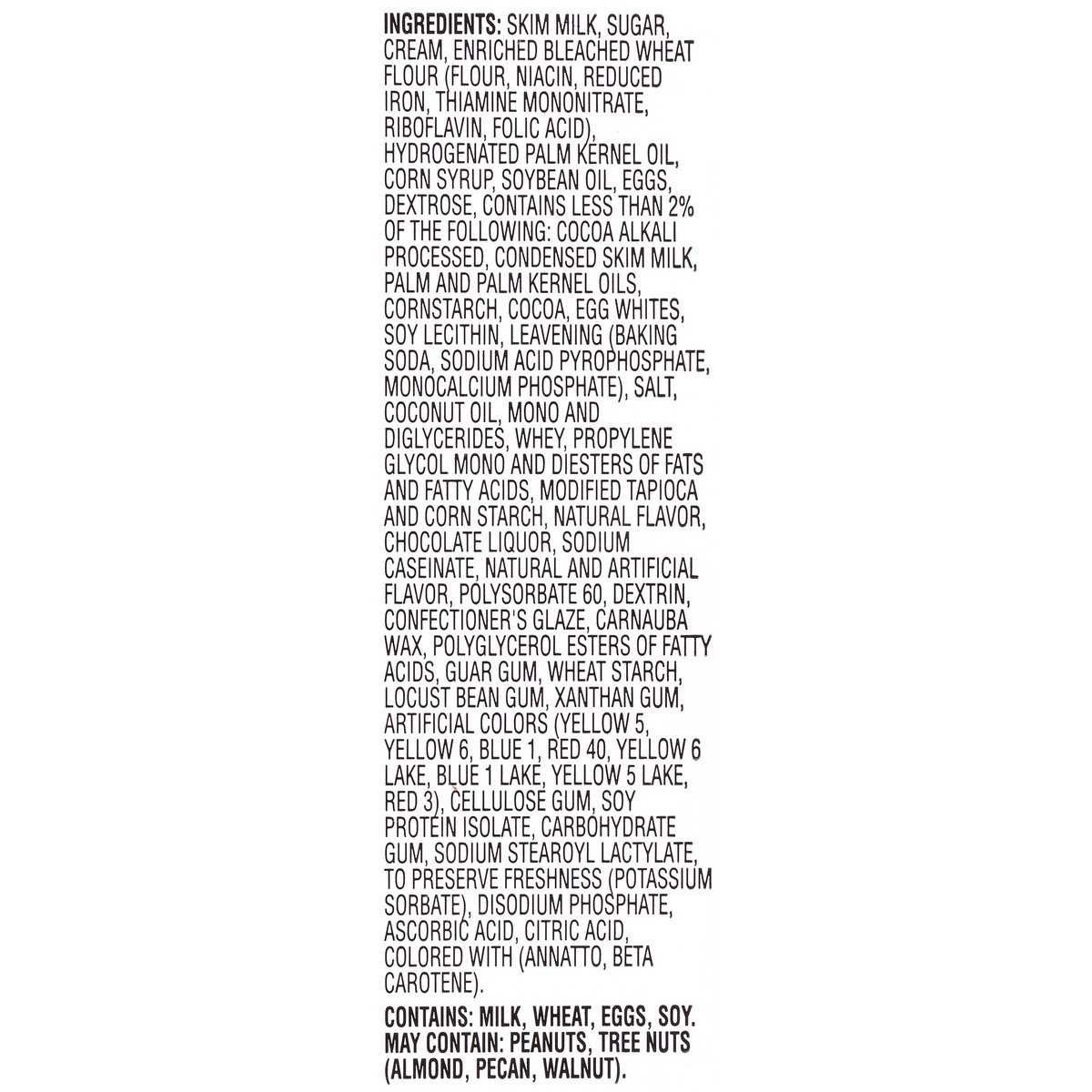 Skim Milk, Sugar, Cream, Enriched Bleached Wheat Flour (Flour, Niacin, Reduced Iron, Thiamine Mononitrate, Riboflavin, Folic Acid), Hydrogenated Palm Kernel Oil, Corn Syrup, Soybean Oil, Eggs, Dextros…
