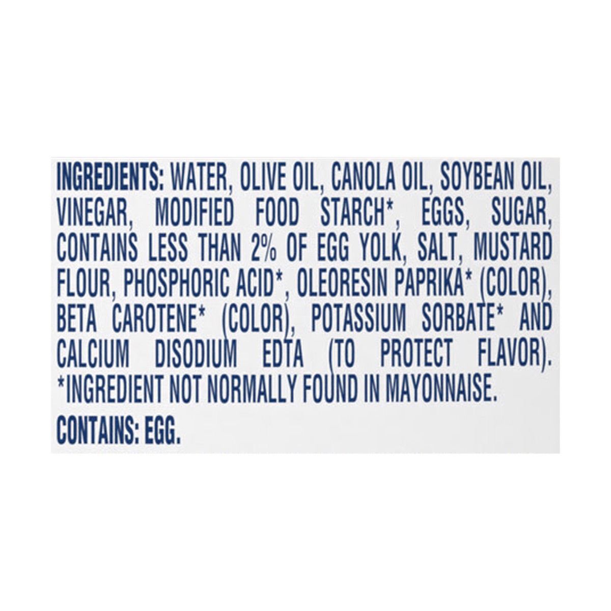 WATER, OLIVE OIL, CANOLA OIL, SOYBEAN OIL, VINEGAR, MODIFIED FOOD STARCH*, EGGS, SUGAR, CONTAINS LESS THAN 2% OF EGG YOLK, SALT, MUSTARD FLOUR, PHOSPHORIC ACID*, OLEORESIN PAPRIKA* (COLOR), BETA CAROT…