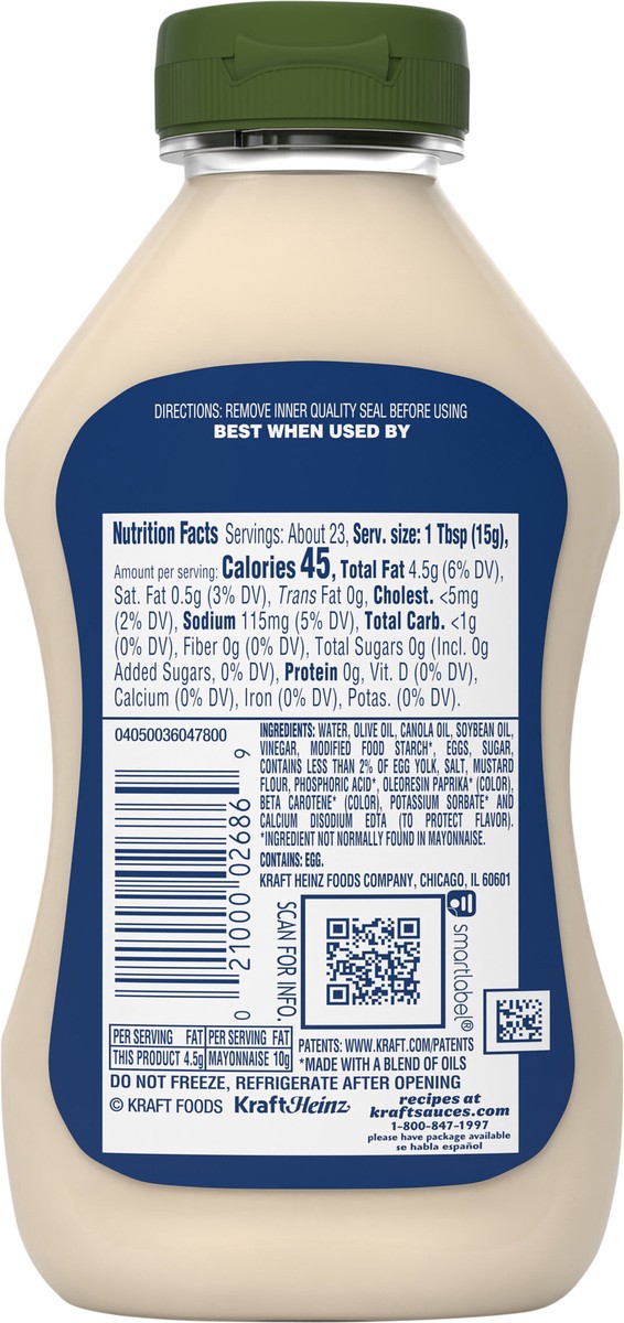 Kraft Mayo Reduced Fat Mayonnaise with Olive Oil offers a smooth, delicious taste because it's produced with only the best ingredients. Made with the finest olive oil and cage-free whole eggs, our red…
