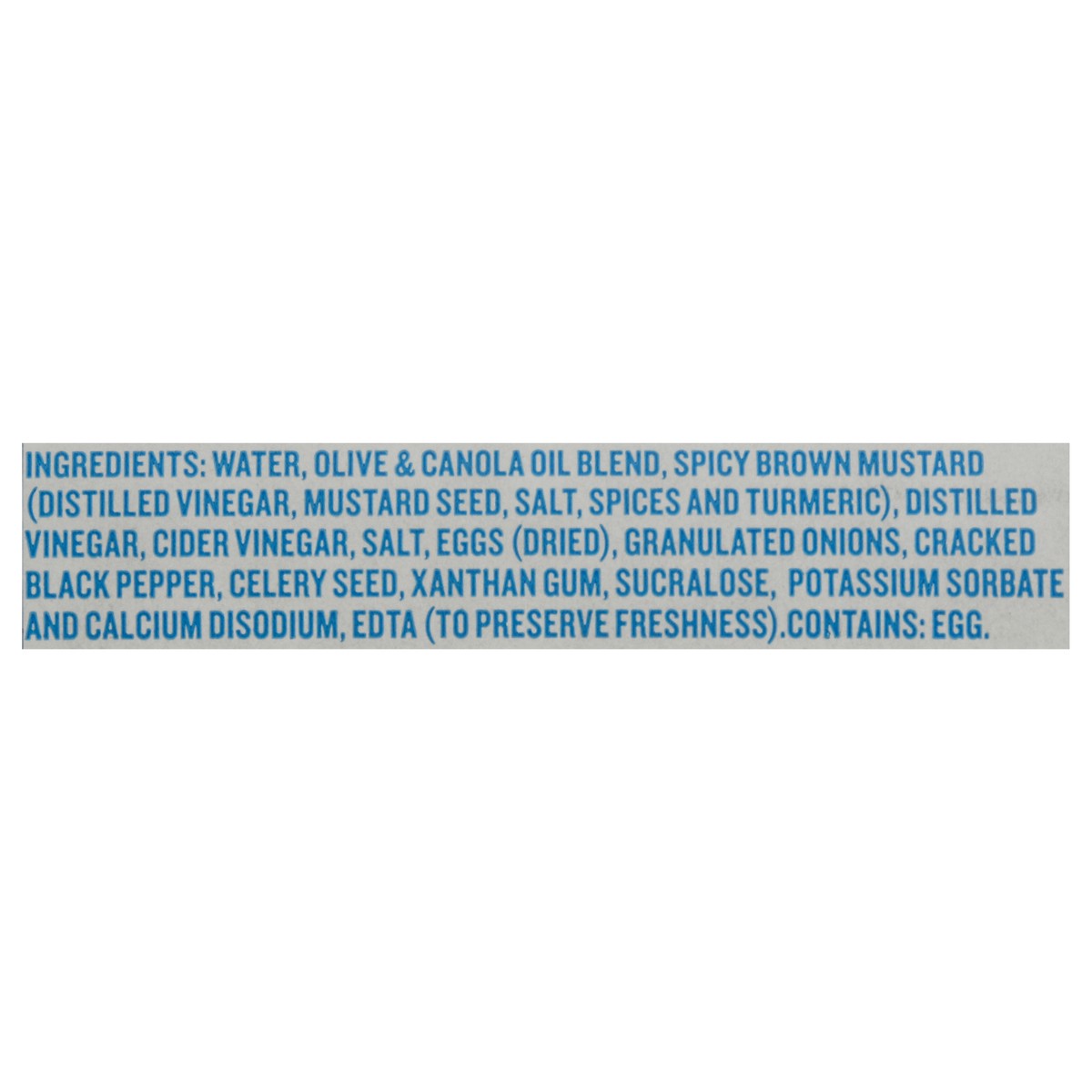 Water, Olive & Canola Oil Blend, Spicy Brown Mustard (Distilled Vinegar, Mustard Seed, Salt, Spices and Turmeric), Distilled Vinegar, Cider Vinegar, Salt, Eggs (Dried), Granulated Onions, Cracked Blac…