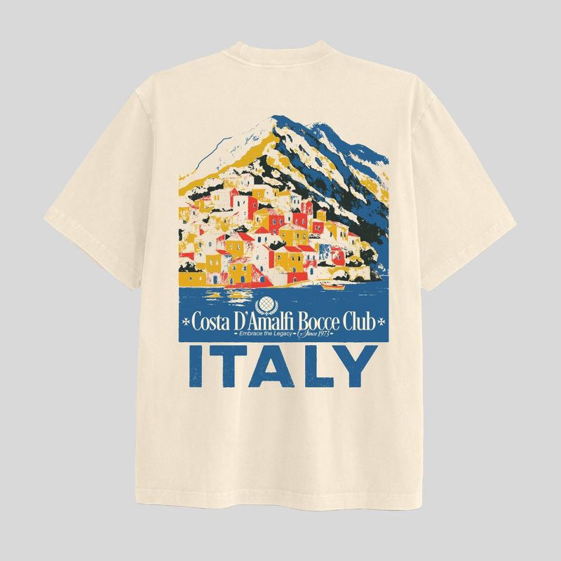 - Cream color with Costa D'Amalfi Bocce Club graphics on front and back