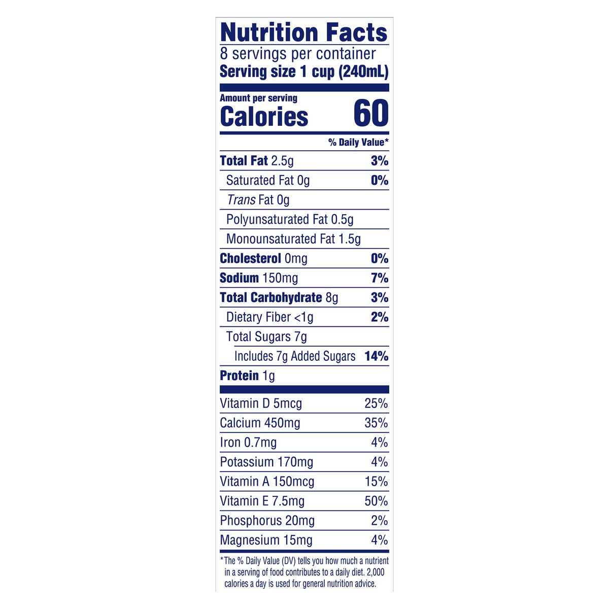 ALMONDMILK (FILTERED WATER, ALMONDS), CANE SUGAR, CALCIUM CARBONATE, SEA SALT, POTASSIUM CITRATE, SUNFLOWER LECITHIN, GELLAN GUM, VITAMIN A PALMITATE, VITAMIN D2, D-ALPHA-TOCOPHEROL (NATURAL VITAMIN E…