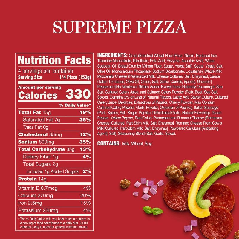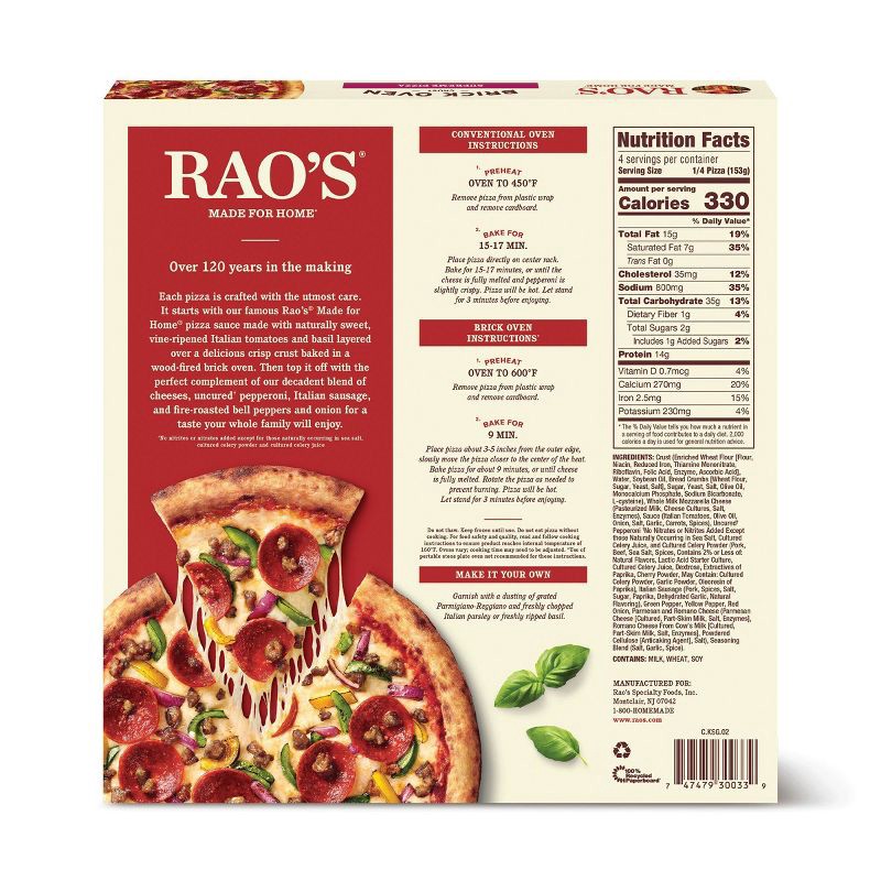- INGREDIENT FOCUSED: Rao's Made for Home Supreme Pizza contains a decadent blend of cheeses and freshly sliced uncured pepperoni, sausage, and fire-roasted bell peppers red onions for a taste your whole family will enjoy.