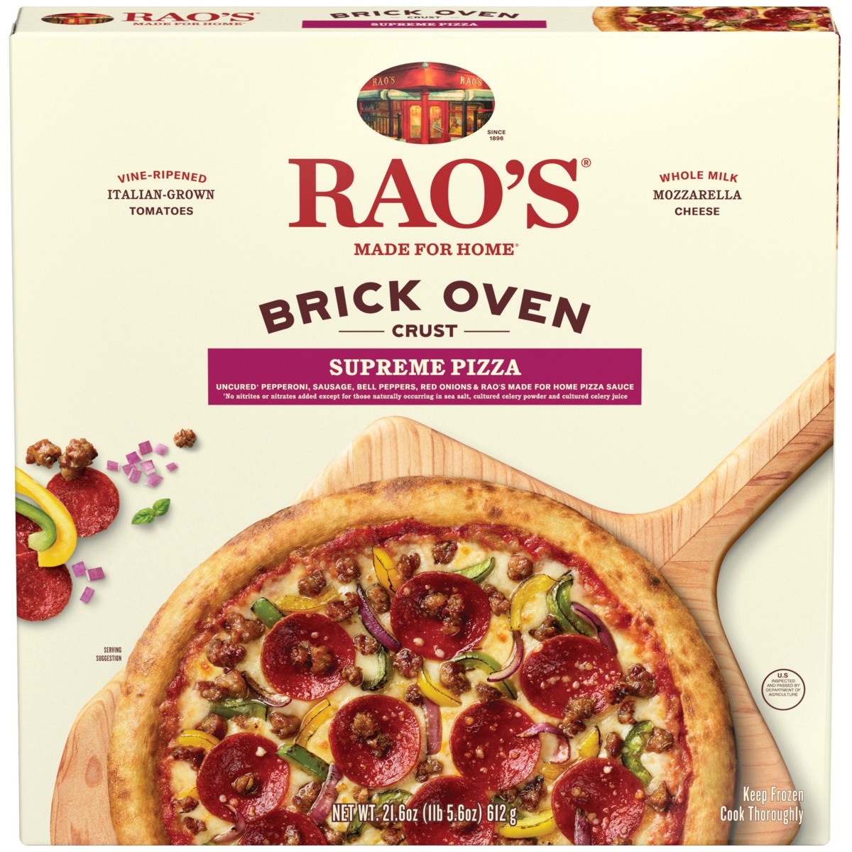 - Rao's Made For Home Supreme Frozen Pizza is topped with pepperoni, Italian sausage, fire-roasted bell peppers, a decadent blend of cheeses & Rao's pizza sauce
