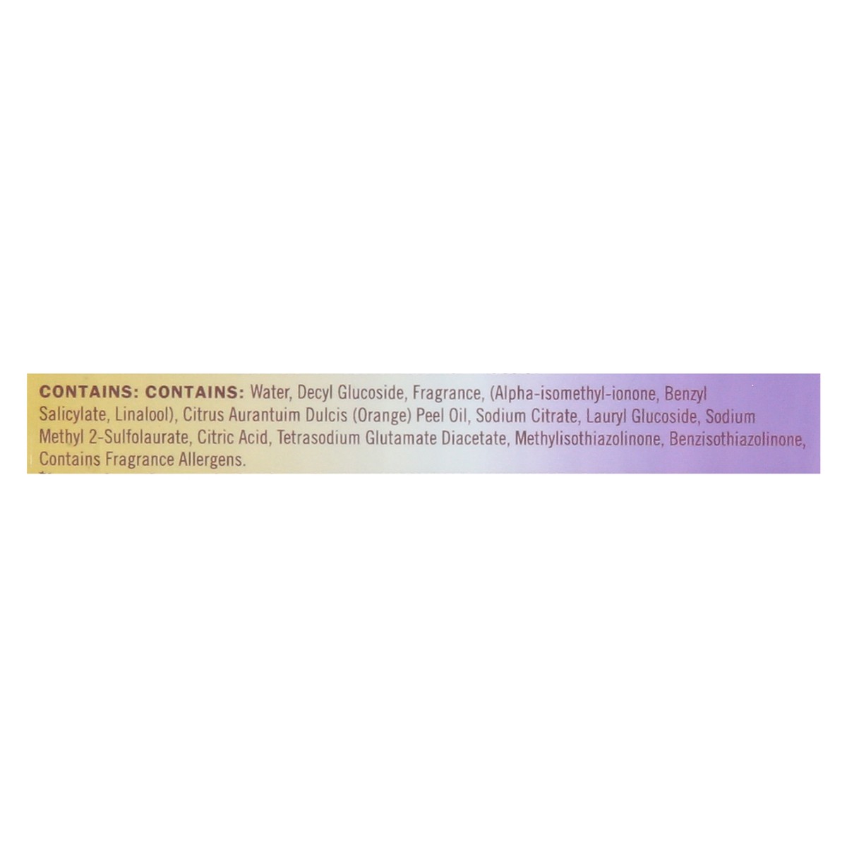 Water; Decyl Glucoside; Fragrance; Citrus Aurantuim Dulcis (Orange) Peel Oil; Sodium Citrate; Lauryl Glucoside; Sodium Methyl 2-Sulfolaurate; Citric Acid; Tetrasodium Glutamate Diacetate; Methylisothi…