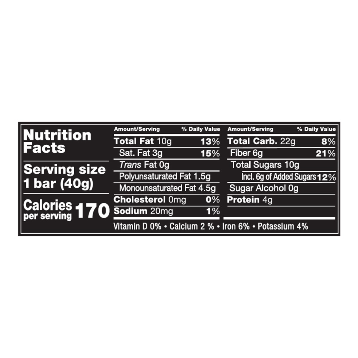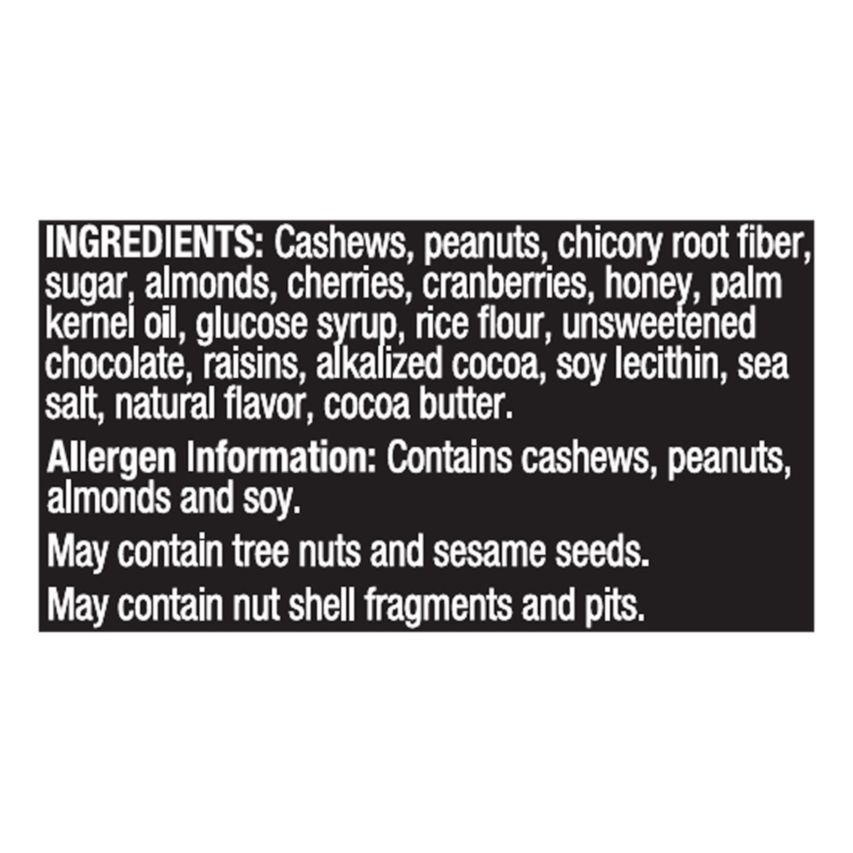 Cashews, Peanuts, Chicory Root Fiber, Sugar, Almonds, Cherries, Cranberries, Honey, Palm Kernel Oil, Glucose Syrup, Rice Flour, Unsweetened Chocolate, Raisins, Alkalized Cocoa, Soy Lecithin, Sea Salt,…