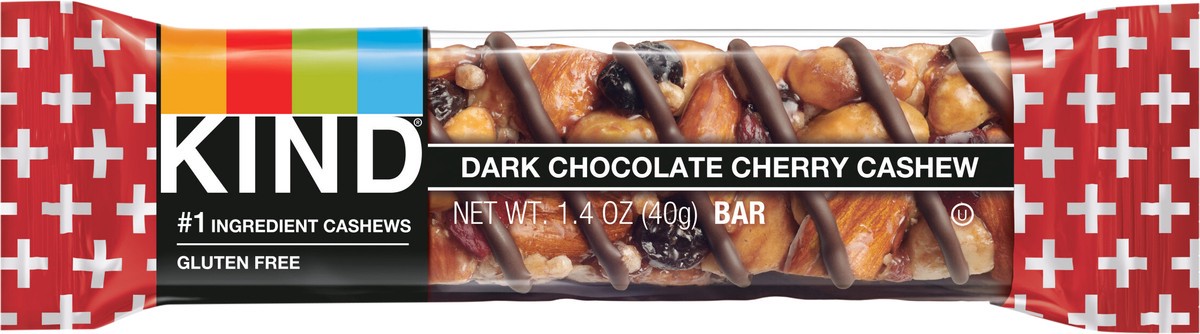 KIND Dark Chocolate Cherry Cashew bars are satisfying gluten free bars packed with nuts and the taste of dark chocolate that you can take anywhere. These KIND nut bars lead with cashews as the #1 ingr…