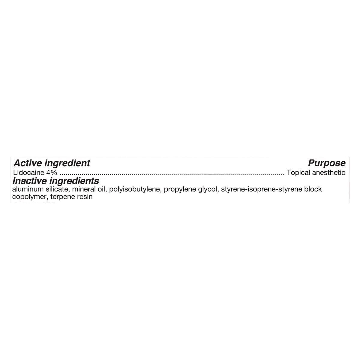 Active Ingredients: Lidocaine (4 %), Topical Anesthetic. Inactive Ingredients: Aluminum Silicate, Mineral Oil, Polyisobutylene, Propylene Glycol, Styrene-Isoprene-Styrene Block Copolymer, Terpene Resi…