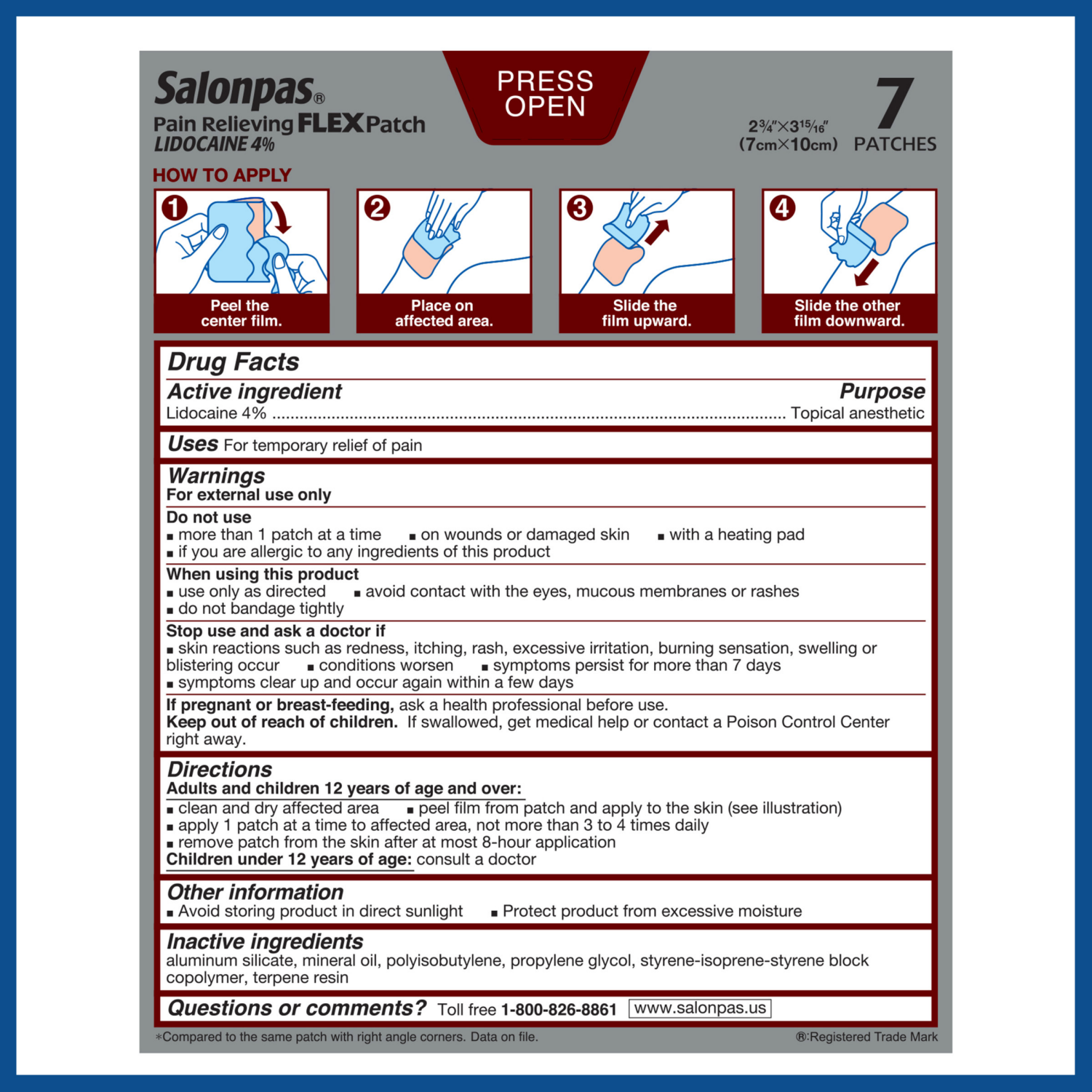 Salonpas Lidocaine 4% FLEX Pain Relieving Patch is the latest innovation from the World’s #1 brand of pain patches.Thin, lightweight, flexible, and highly adhesive, the Salonpas FLEX Pain Relieving Pa…