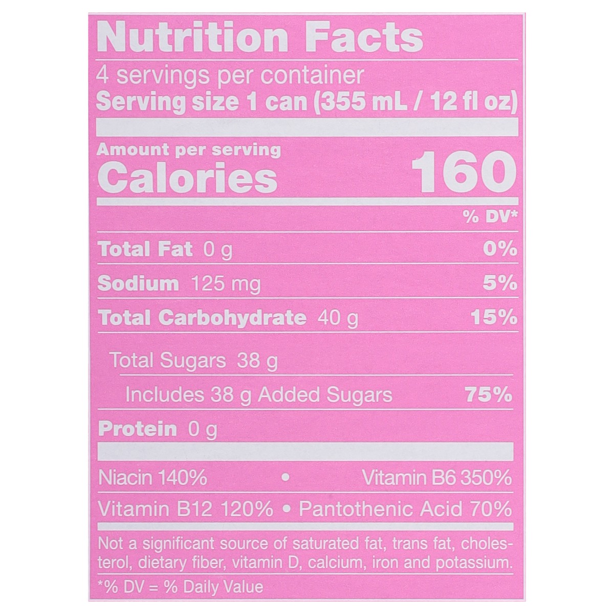 - Each 12 fl oz can contains 160 calories, 114mg of caffeine which helps to increase alertness, plus 38g of real sugar similar to a glass of apple juice of the same size. Trusted and consumed by world renowned athletes and everyday fitness enthusiasts